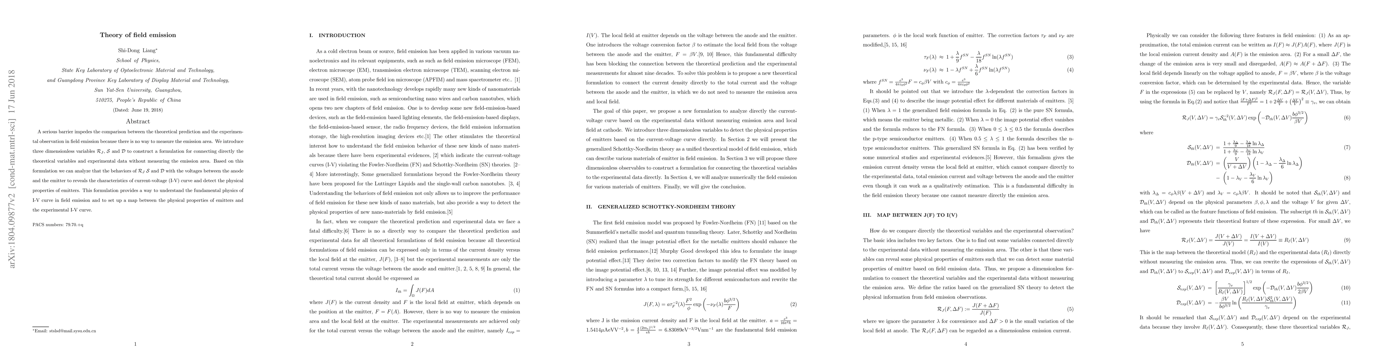 A serious barrier impedes the comparison between the theoretical prediction and the experimental observation in field emission because there is no way to measure the emission area. We introduce three dimensionless variables $\mathcal{R}_{J}$, $\mathcal{S}$ and $\mathcal{D}$ to construct a formulation for connecting directly the theoretical variables and experimental data without measuring the emission area. Based on this formulation we can analyze that the behaviors of $\mathcal{R}_{J}$ $\mathcal{S}$ and $\mathcal{D}$ with the voltages between the anode and the emitter to reveals the characteristics of current-voltage (I-V) curve and detect the physical properties of emitters. This formulation provides a way to understand the fundamental physics of I-V curve in field emission and to set up a map between the physical properties of emitters and the experimental I-V curve.