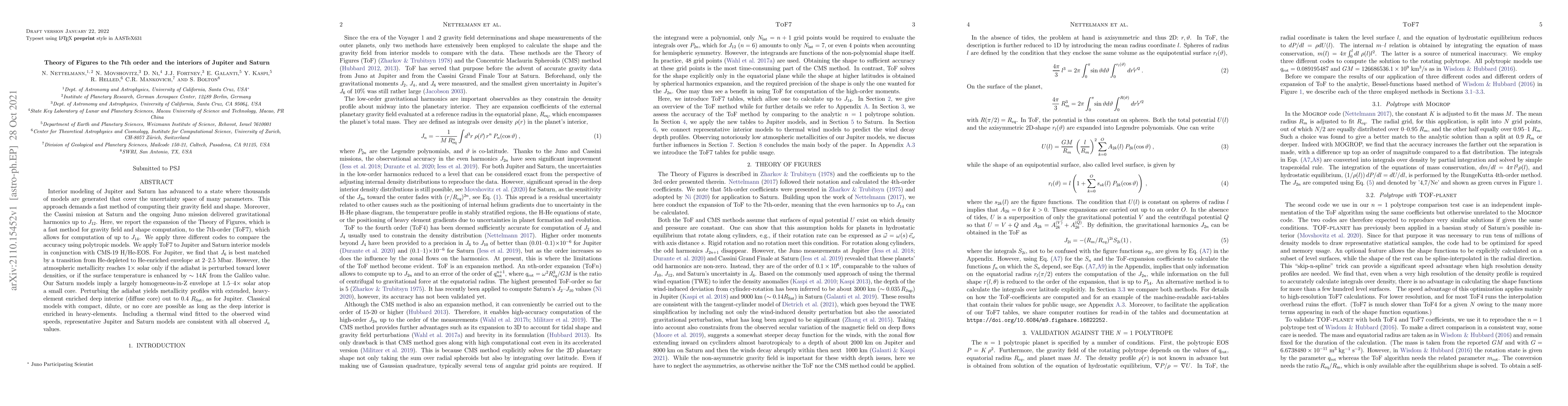 This paper expands the Theory of Figures to the 7th order (ToF7) for fast computation of gravity fields and shapes, enabling up to J14 calculations. Applying ToF7 to Jupiter and Saturn models, it finds that Jupiter's best-matched J6 is achieved by a transition from He-depleted to He-enriched envelope, while Saturn's models suggest a homogeneous-in-Z envelope with heavy-element enrichment.