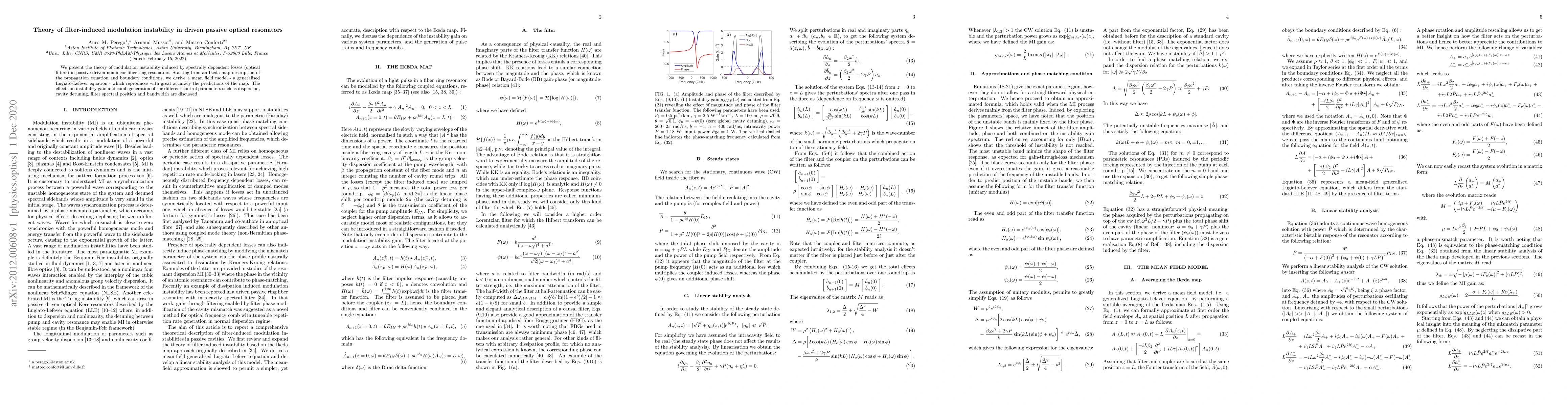We present the theory of modulation instability induced by spectrally dependent losses (optical filters) in passive driven nonlinear fiber ring resonators. Starting from an Ikeda map description of the propagation equation and boundary conditions, we derive a mean field model - a generalised Lugiato-Lefever equation - which reproduces with great accuracy the predictions of the map. The effects on instability gain and comb generation of the different control parameters such as dispersion, cavity detuning, filter spectral position and bandwidth are discussed.