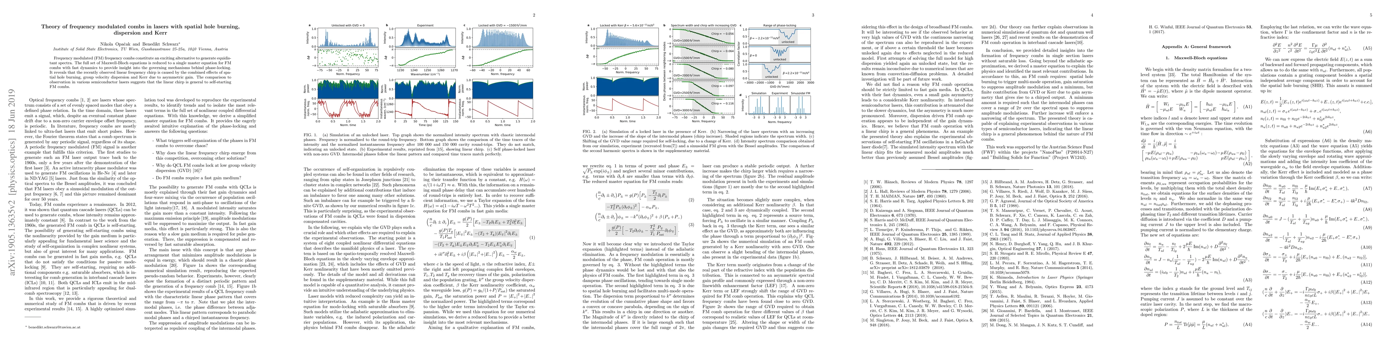This paper develops a theoretical framework to understand frequency modulated combs in lasers, reducing Maxwell-Bloch equations to a master equation. It reveals that linear frequency chirp in these combs is due to spatial hole burning, group velocity dispersion, and Kerr effects from asymmetric gain, suggesting this behavior is common in self-starting frequency combs.