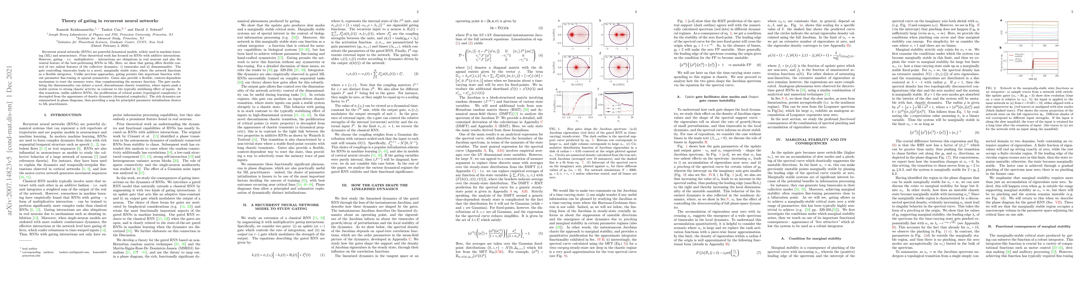 This paper explores the theoretical implications of gating in recurrent neural networks (RNNs), demonstrating how gating controls timescales and dimensionality, enabling flexible integration and context-dependent memory reset. It introduces a novel marginally stable state and a discontinuous chaotic transition, offering insights into parameter initialization for machine learning applications.