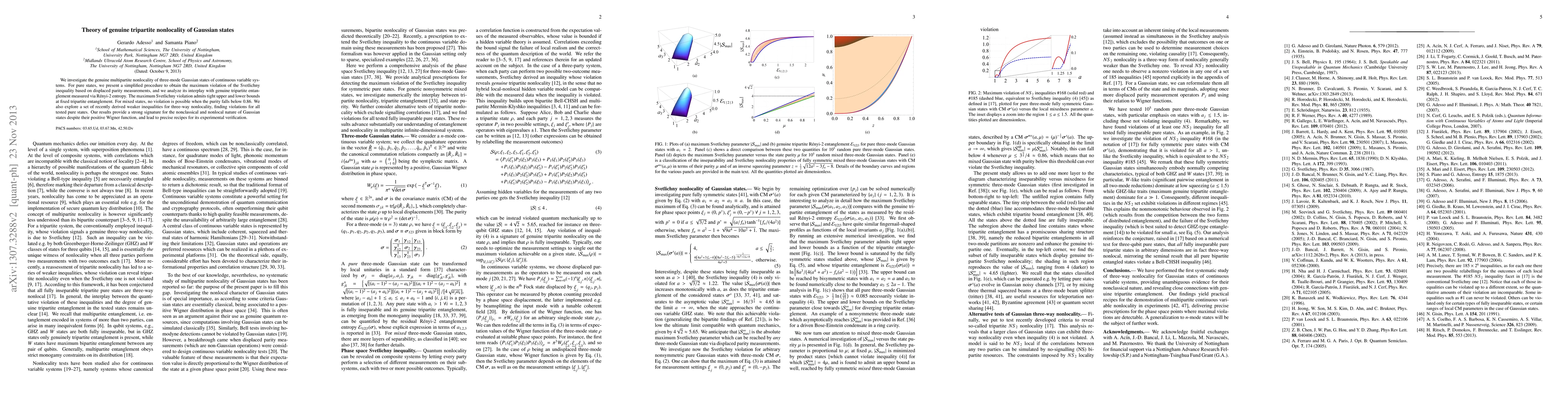 This paper investigates the genuine tripartite nonlocality in three-mode Gaussian states, showing maximum Svetlichny inequality violations via displaced parity measurements and linking it to tripartite entanglement. For mixed states, no violation occurs below a purity of 0.86, while weaker inequalities show violations for pure states, highlighting the nonclassical and nonlocal nature of Gaussian states.