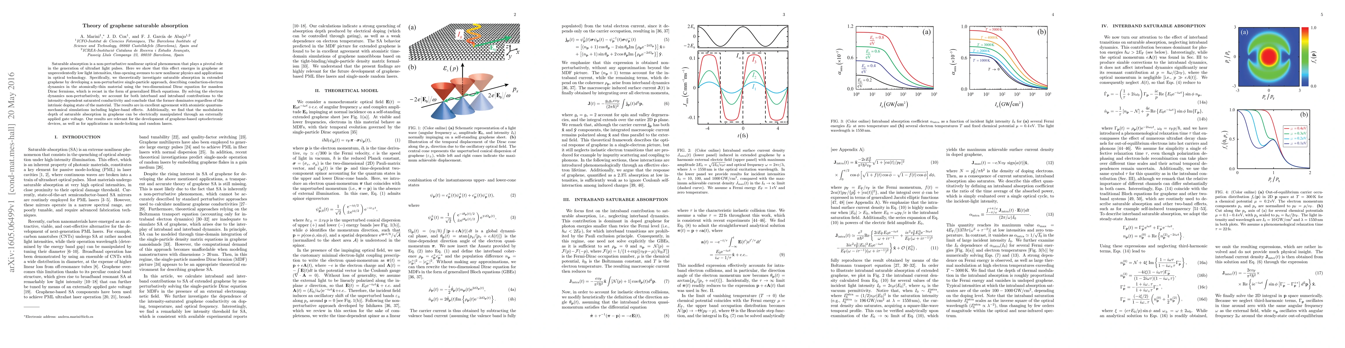 This paper theoretically investigates saturable absorption in graphene, revealing its emergence at low light intensities due to interband contributions, and demonstrates its potential for ultrafast optical pulse generation and manipulation via gate voltage. The findings support the development of graphene-based optoelectronic devices and applications in mode-locking and random lasers.