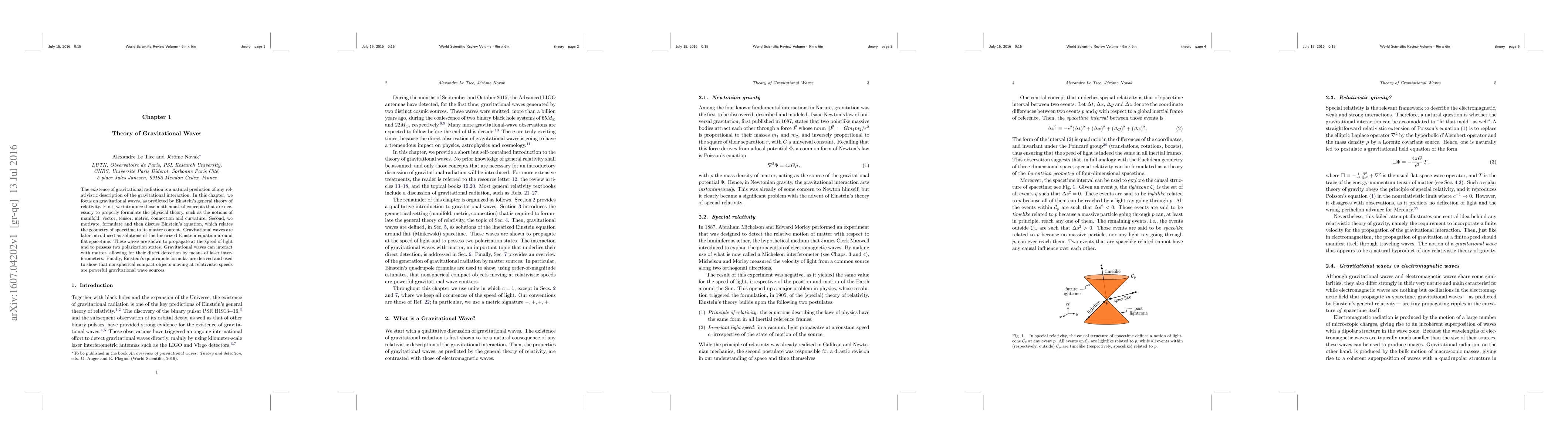 The existence of gravitational radiation is a natural prediction of any relativistic description of the gravitational interaction. In this chapter, we focus on gravitational waves, as predicted by Einstein's general theory of relativity. First, we introduce those mathematical concepts that are necessary to properly formulate the physical theory, such as the notions of manifold, vector, tensor, metric, connection and curvature. Second, we motivate, formulate and then discuss Einstein's equation, which relates the geometry of spacetime to its matter content. Gravitational waves are later introduced as solutions of the linearized Einstein equation around flat spacetime. These waves are shown to propagate at the speed of light and to possess two polarization states. Gravitational waves can interact with matter, allowing for their direct detection by means of laser interferometers. Finally, Einstein's quadrupole formulas are derived and used to show that nonspherical compact objects moving at relativistic speeds are powerful gravitational wave sources.