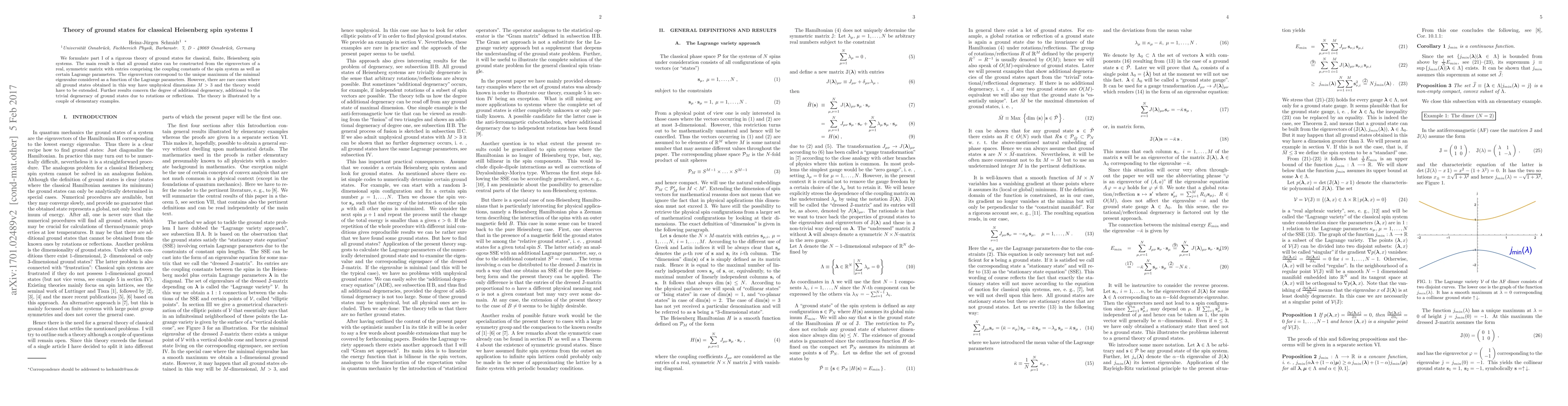 This paper develops a rigorous theory for ground states in classical Heisenberg spin systems, showing that they can be constructed from eigenvectors of a symmetric matrix formed by coupling constants and Lagrange parameters. However, the theory requires extension for cases where unphysical dimensions arise.
