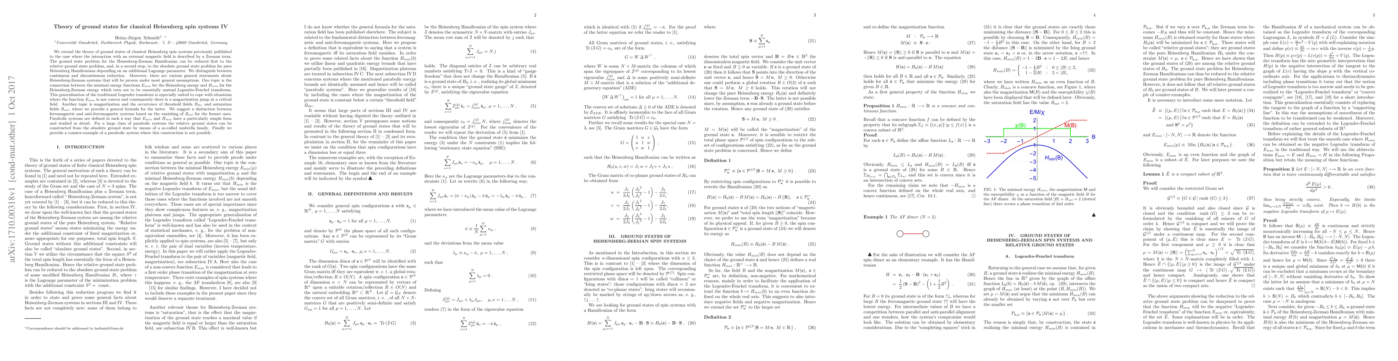 We extend the theory of ground states of classical Heisenberg spin systems previously published to the case where the interaction with an external magnetic field is described by a Zeeman term. The ground state problem for the Heisenberg-Zeeman Hamiltonian can be reduced first to the relative ground state problem, and, in a second step, to the absolute ground state problem for pure Heisenberg Hamiltonians depending on an additional Lagrange parameter. We distinguish between continuous and discontinuous reduction. Moreover, there are various general statements about Heisenberg-Zeeman systems that will be proven under most general assumptions. One topic is the connection between the minimal energy functions $E_{min}$ for the Heisenberg energy and $H_{min}$ for the Heisenberg-Zeeman energy which turn out to be essentially mutual Legendre-Fenchel transforms. This generalization of the traditional Legendre transform is especially suited to cope with situations where the function $E_{min}$ is not convex and consequently there is a magnetization jump at a critical field. Another topic is magnetization and the occurrence of threshold fields $B_{thr}$ and saturation fields $B_{sat}$, where we provide a general formula for the latter. We suggest a distinction between ferromagnetic and anti-ferromagnetic systems based on the vanishing of $B_{sat}$ for the former ones. Parabolic systems are defined in such a way that $E_{min}$ and $H_{min}$ have a particularly simple form and studied in detail. For a large class of parabolic systems the relative ground states can be constructed from the absolute ground state by means of a so-called umbrella family. Finally we provide a counter-example of a parabolic system where this construction is not possible.