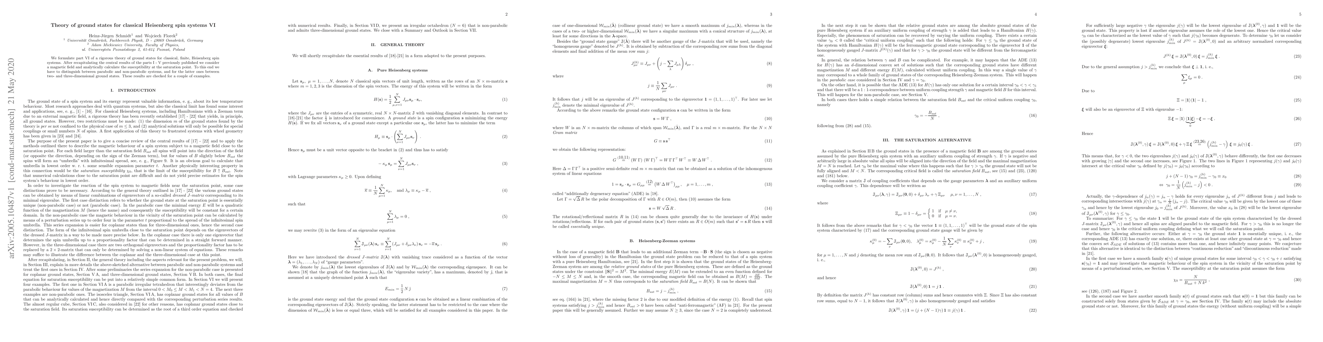 We formulate part VI of a rigorous theory of ground states for classical, finite, Heisenberg spin systems. After recapitulating the central results of the parts I - V previously published we consider a magnetic field and analytically calculate the susceptibility at the saturation point. To this end we have to distinguish between parabolic and non-parabolic systems, and for the latter ones between two- and three-dimensional ground states. These results are checked for a couple of examples.