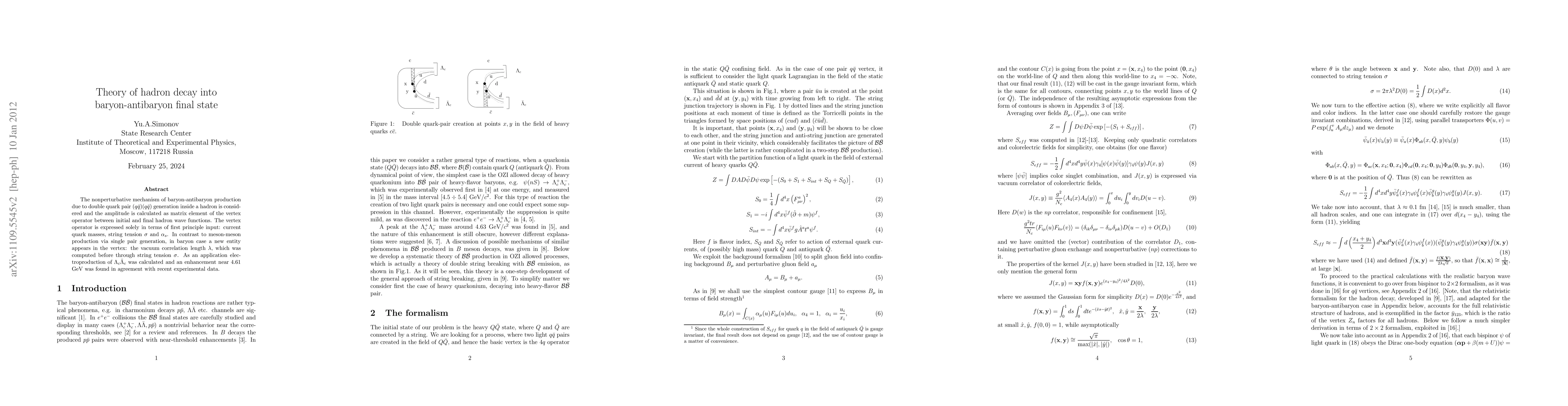 The nonperturbative mechanism of baryon-antibaryon production due to double quark pair $(q\bar q)$($q\bar q)$ generation inside a hadron is considered and the amplitude is calculated as matrix element of the vertex operator between initial and final hadron wave functions. The vertex operator is expressed solely in terms of first principle input: current quark masses, string tension $\sigma$ and $\alpha_s$. In contrast to meson-meson production via single pair generation, in baryon case a new entity appears in the vertex: the vacuum correlation length $\lambda $, which was computed before through string tension $\sigma$. As an application electroproduction of $\Lambda_c \bar\Lambda_c$ was calculated and an enhancement near 4.61 GeV was found in agreement with recent experimental data.