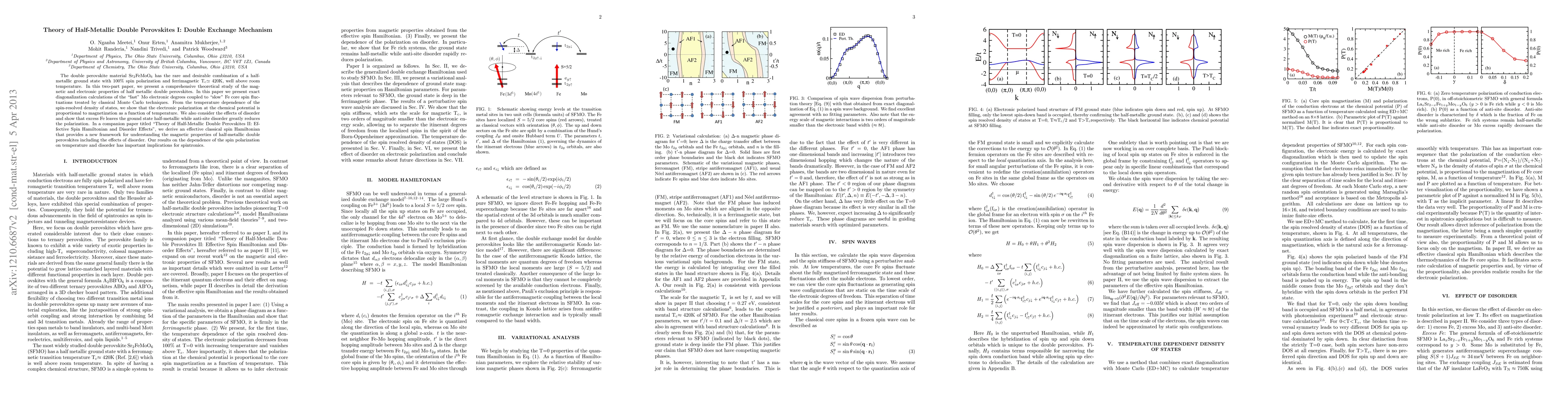 This paper presents a theoretical study of half-metallic double perovskites, specifically SFMO, showing that it exhibits 100% spin polarization and ferrimagnetic ordering above room temperature. The study uses exact diagonalization and Monte Carlo techniques to analyze the electronic and magnetic properties, revealing the dependence of spin polarization on temperature and the effects of disorder on maintaining half-metallicity.