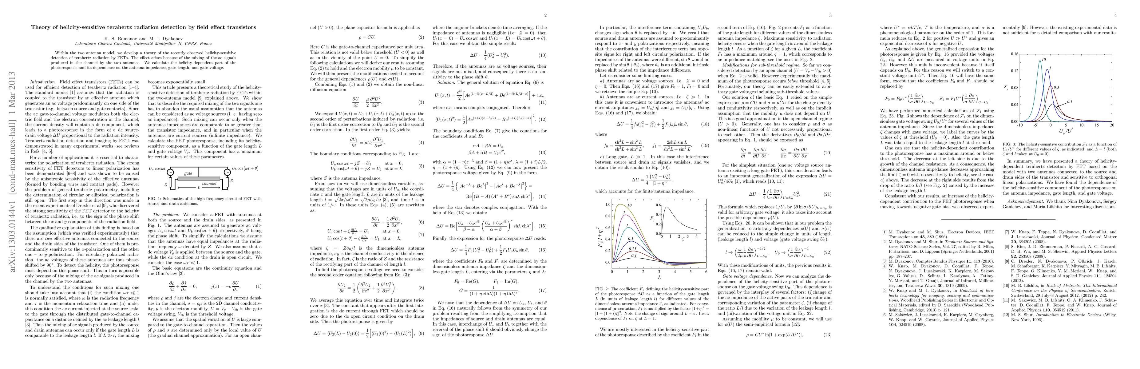 This paper develops a theoretical framework for helicity-sensitive terahertz radiation detection using field-effect transistors (FETs), attributing it to the mixing of ac signals from two antennas within the device. The study quantifies the helicity-dependent photoresponse and its dependence on antenna impedance, gate length, and gate voltage.