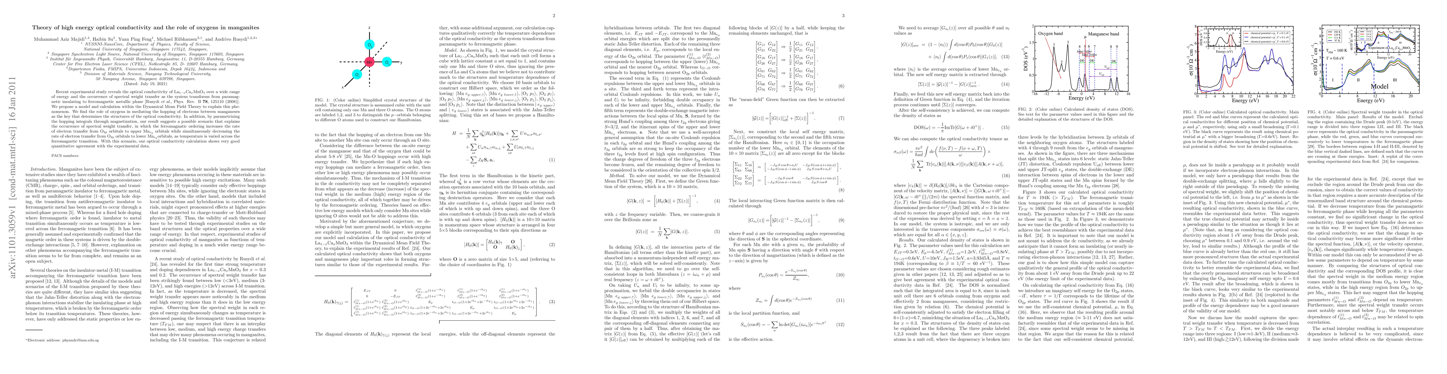 Recent experimental study reveals the optical conductivity of La$_{1-x}$Ca$_x$MnO$_3$ over a wide range of energy and the occurrence of spectral weight transfer as the system transforms from paramagnetic insulating to ferromagnetic metallic phase [Rusydi {\it et al.}, Phys. Rev. B {\bf 78}, 125110 (2008)]. We propose a model and calculation within the Dynamical Mean Field Theory to explain this phenomenon. We find the role of oxygens in mediating the hopping of electrons between manganeses as the key that determines the structures of the optical conductivity. In addition, by parametrizing the hopping integrals through magnetization, our result suggests a possible scenario that explains the occurrence of spectral weight transfer, in which the ferromagnatic ordering increases the rate of electron transfer from O$_{2p}$ orbitals to upper Mn$_{e_g}$ orbitals while simultaneously decreasing the rate of electron transfer from O$_{2p}$ orbitals to lower Mn$_{e_g}$orbitals, as temperature is varied across the ferromagnetic transition. With this scenario, our optical conductivity calculation shows very good quantitative agreement with the experimental data.