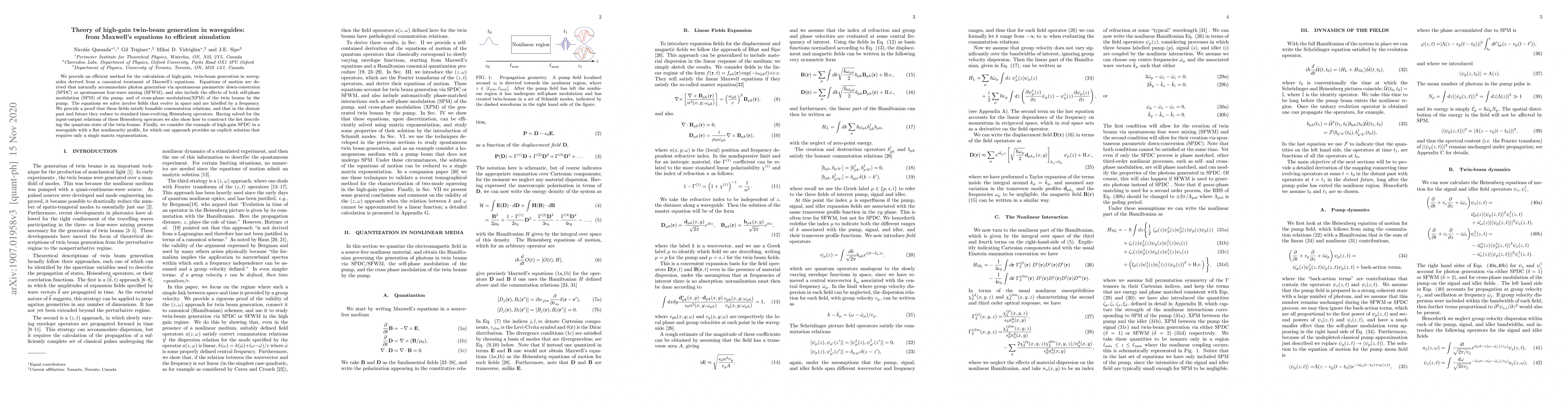 We provide an efficient method for the calculation of high-gain, twin-beam generation in waveguides derived from a canonical treatment of Maxwell's equations. Equations of motion are derived that naturally accommodate photon generation via spontaneous parametric down-conversion (SPDC) or spontaneous four-wave mixing (SFWM), and also include the effects of both self-phase modulation (SPM) of the pump, and of cross-phase modulation(XPM) of the twin beams by the pump. The equations we solve involve fields that evolve in space and are labelled by a frequency. We provide a proof that these fields satisfy bonafide commutation relations, and that in the distant past and future they reduce to standard time-evolving Heisenberg operators. Having solved for the input-output relations of these Heisenberg operators we also show how to construct the ket describing the quantum state of the twin-beams. Finally, we consider the example of high-gain SPDC in a waveguide with a flat nonlinearity profile, for which our approach provides an explicit solution that requires only a single matrix exponentiation.