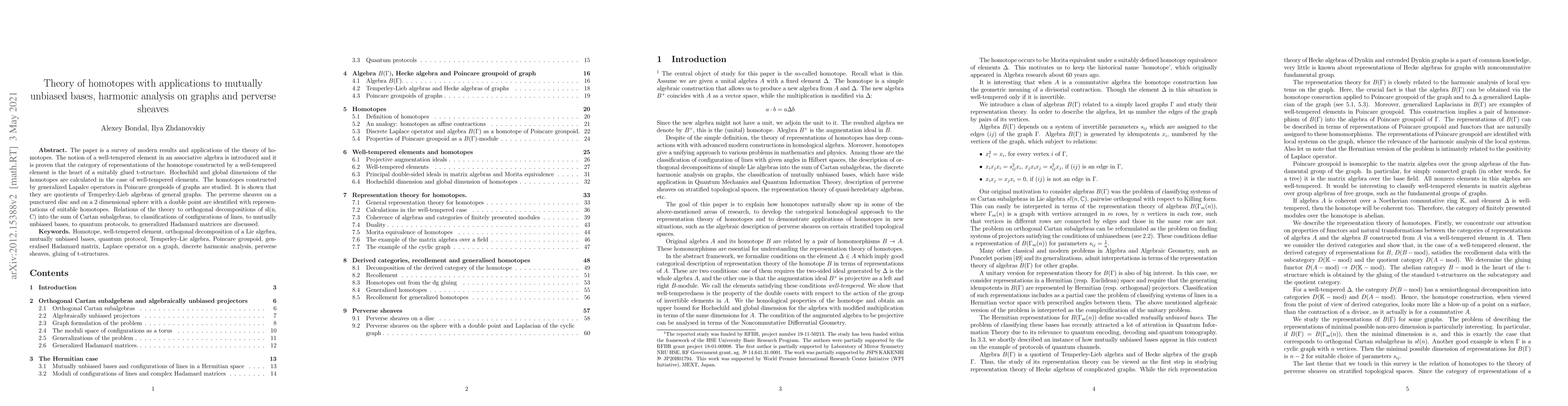 The paper is the survey of the modern results and applications of the theory of homotopes. The notion of a well-tempered element in an associative algebra is introduced and it is proven that the category of representations of the homotope constructed by a well-tempered element is the heart of a suitably glued t-structure. Hochschild and global dimensions of the homotopes are calculated. The homotopes constructed by generalized Lapalce operators in Poincare groupoids of graphs are studied. It is shown that they are quotients of Temperley-Lieb algebras of general graphs. The perverse sheaves on a punctured disc and on a 2 dimensional sphere with a double point are identified with representations of suitable homotopes. Relations of the theory to orthogonal decompositions of sl(n, C) into the sum of Cartan subalgebras, to classifications of configurations of lines, to mutually unbiased bases, to quantum protocols, to generalized Hadamard matrices are discussed.