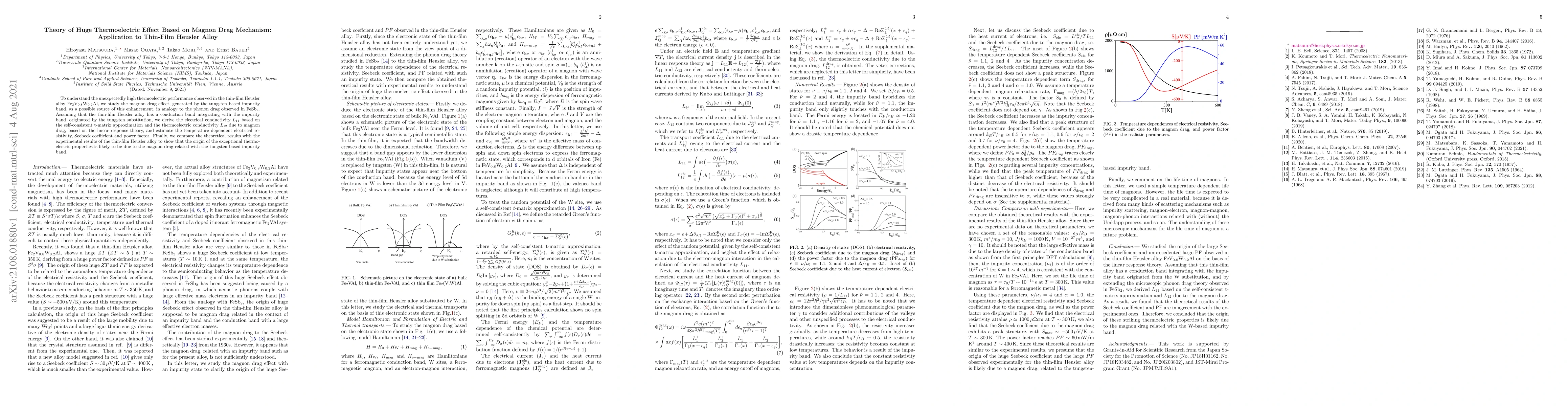 This paper investigates the magnon drag effect in thin-film Heusler alloy Fe$_2$V$_{0.8}$W$_{0.2}$Al to explain its high thermoelectric performance, proposing that the tungsten-based impurity band enhances thermoelectric properties analogous to phonon drag in FeSb$_2$. Theoretical models predict the electrical conductivity and thermoelectric conductivity, showing that magnon drag is likely the source of the observed thermoelectric effects.