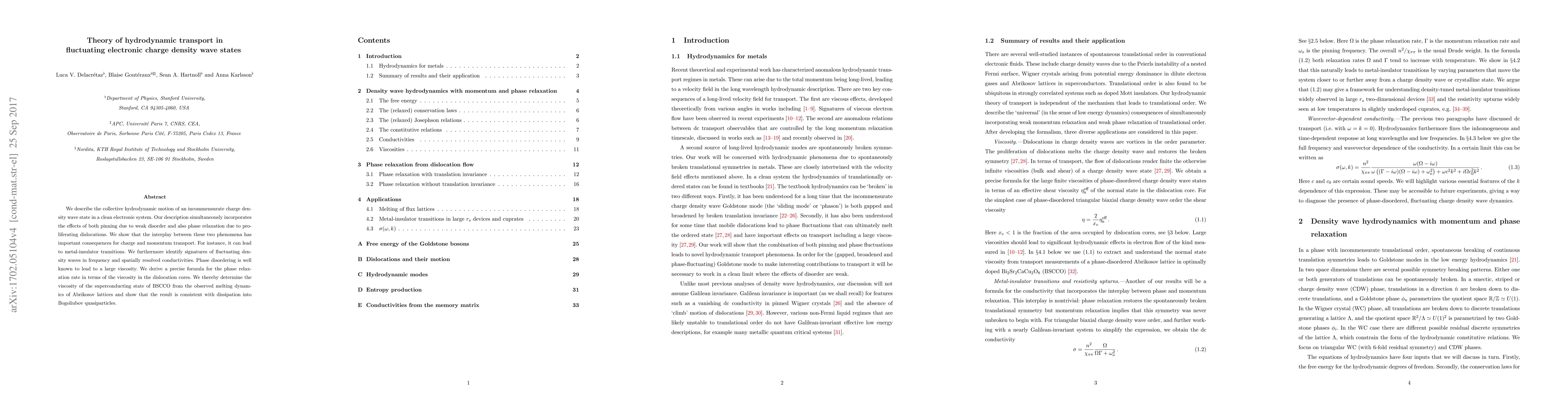 We describe the collective hydrodynamic motion of an incommensurate charge density wave state in a clean electronic system. Our description simultaneously incorporates the effects of both pinning due to weak disorder and also phase relaxation due to proliferating dislocations. We show that the interplay between these two phenomena has important consequences for charge and momentum transport. For instance, it can lead to metal-insulator transitions. We furthermore identify signatures of fluctuating density waves in frequency and spatially resolved conductivities. Phase disordering is well known to lead to a large viscosity. We derive a precise formula for the phase relaxation rate in terms of the viscosity in the dislocation cores. We thereby determine the viscosity of the superconducting state of BSCCO from the observed melting dynamics of Abrikosov lattices and show that the result is consistent with dissipation into Bogoliubov quasiparticles.