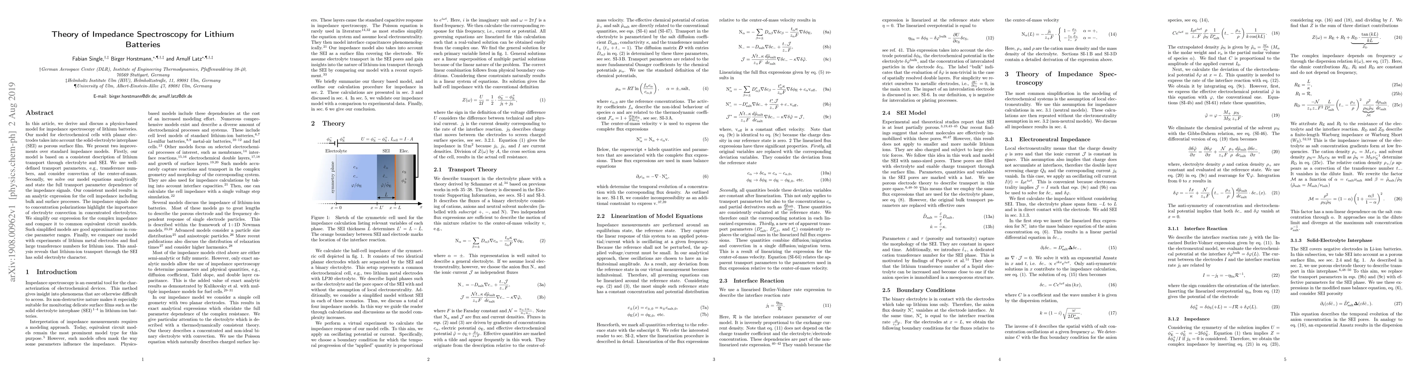 In this article, we derive and discuss a physics-based model for impedance spectroscopy of lithium batteries. Our model for electrochemical cells with planar electrodes takes into account the solid-electrolyte interphase (SEI) as porous surface film. We present two improvements over standard impedance models. Firstly, our model is based on a consistent description of lithium transport through electrolyte and SEI. We use well-defined transport parameters, e.g., transference numbers, and consider convection of the center-of-mass. Secondly, we solve our model equations analytically and state the full transport parameter dependence of the impedance signals. Our consistent model results in an analytic expression for the cell impedance including bulk and surface processes. The impedance signals due to concentration polarizations highlight the importance of electrolyte convection in concentrated electrolytes. We simplify our expression for the complex impedance and compare it to common equivalent circuit models. Such simplified models are good approximations in concise parameter ranges. Finally, we compare our model with experiments of lithium metal electrodes and find large transference numbers for lithium ions. This analysis reveals that lithium-ion transport through the SEI has solid electrolyte character.