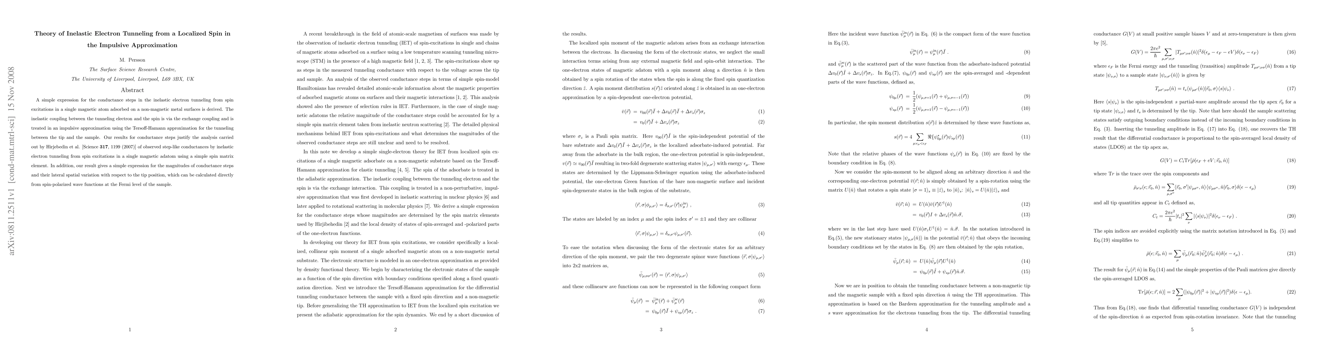 This paper derives a simple expression for conductance steps in inelastic electron tunneling from a localized spin in a single magnetic atom on a non-magnetic metal surface. The study uses an impulsive approximation and Tersoff-Hamann model to justify observed step-like conductances and provides a method to calculate the magnitudes and spatial variations of these steps based on spin-polarized wave functions.