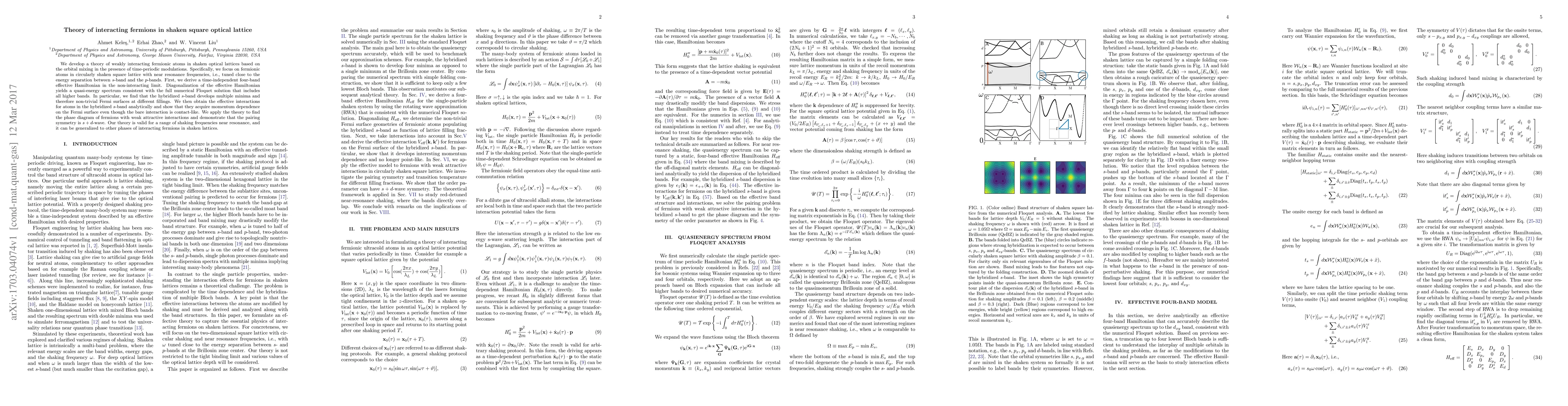 This paper develops a theory for weakly interacting fermions in shaken optical lattices, focusing on circularly shaken square lattices. It derives a four-band effective Hamiltonian, shows hybridized $s$-band formation with non-trivial Fermi surfaces, and finds momentum-dependent effective interactions. The theory predicts an $s+d$-wave pairing symmetry in the phase diagram for weakly attractive fermions.