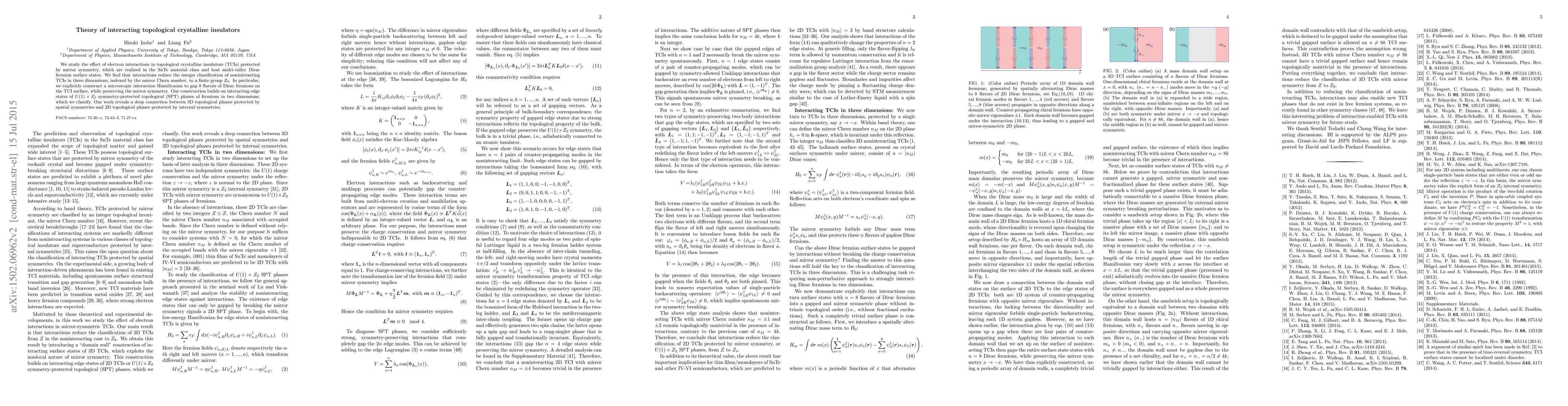 We study the effect of electron interactions in topological crystalline insulators (TCIs) protected by mirror symmetry, which are realized in the SnTe material class and host multi-valley Dirac fermion surface states. We find that interactions reduce the integer classification of noninteracting TCIs in three dimensions, indexed by the mirror Chern number, to a finite group $Z_8$. In particular, we explicitly construct a microscopic interaction Hamiltonian to gap 8 flavors of Dirac fermions on the TCI surface, while preserving the mirror symmetry. Our construction builds on interacting edge states of $U(1)\times Z_2$ symmetry-protected topological (SPT) phases of fermions in two dimensions, which we classify. Our work reveals a deep connection between 3D topological phases protected by spatial symmetries and 2D topological phases protected by internal symmetries.