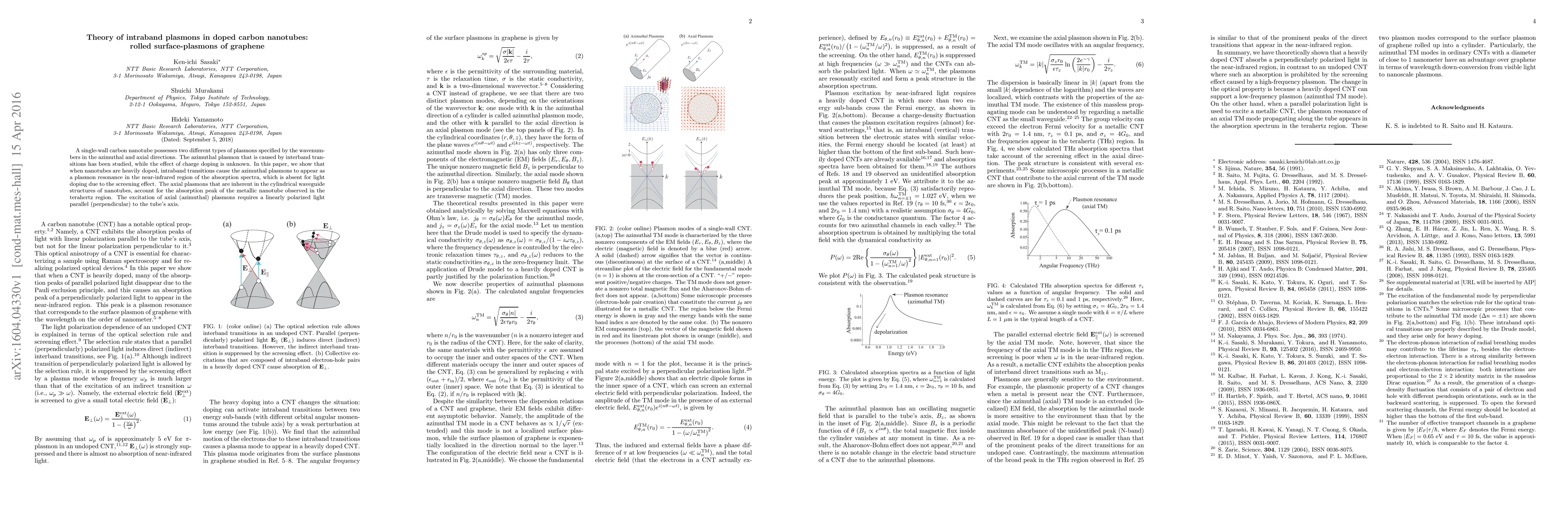 This paper investigates the impact of charge doping on intraband plasmons in doped carbon nanotubes, revealing that heavily doped nanotubes exhibit azimuthal plasmon resonances in the near-infrared due to intraband transitions, contrasting with light doping where such resonances are screened. Axial plasmons, inherent in the cylindrical structure, cause metallic nanotube absorption in the terahertz region.