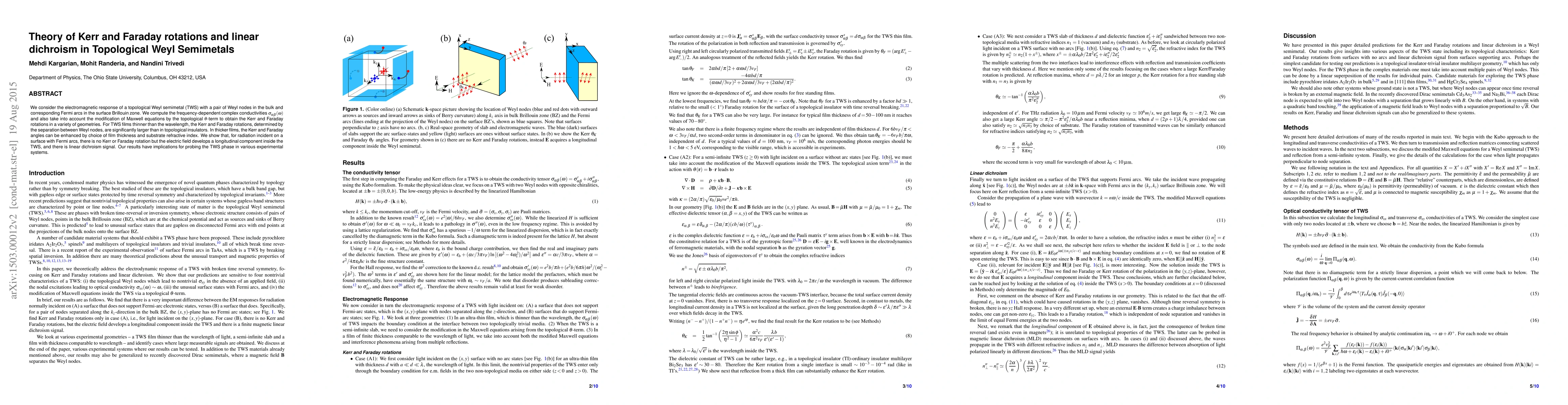 This paper investigates the electromagnetic response of topological Weyl semimetals, focusing on Kerr and Faraday rotations and linear dichroism. It finds that thin films exhibit significantly larger Kerr and Faraday rotations due to the separation between Weyl nodes, while thicker films allow for enhanced rotations through film thickness and substrate refractive index manipulation.