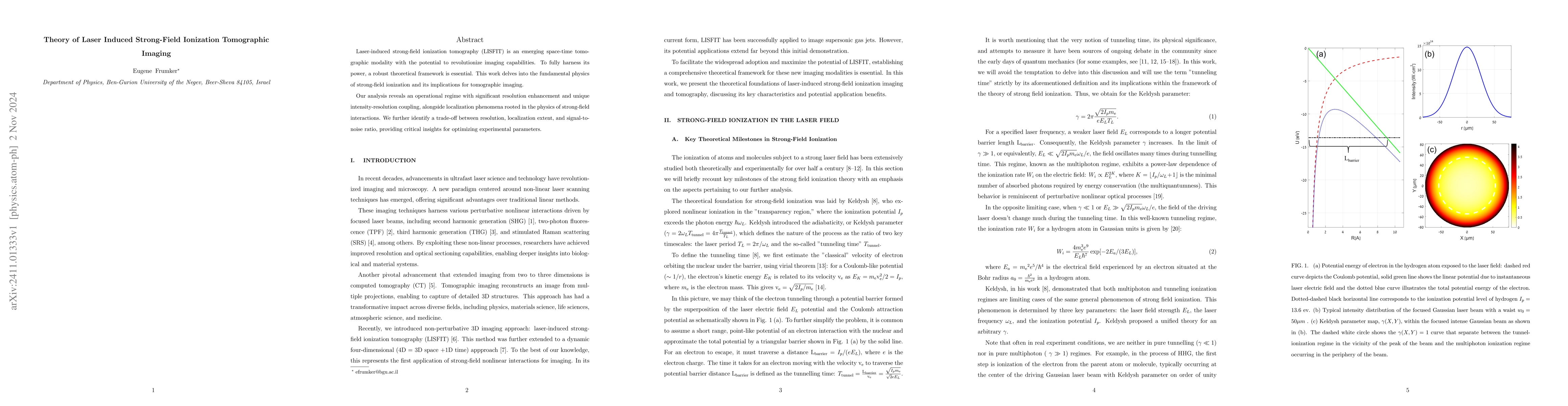 Laser-induced strong-field ionization tomography (LISFIT) is an emerging space-time tomographic modality with the potential to revolutionize imaging capabilities. To fully harness its power, a robust theoretical framework is essential. This work delves into the fundamental physics of strong-field ionization and its implications for tomographic imaging. Our analysis reveals an operational regime with significant resolution enhancement and unique intensity-resolution coupling, alongside localization phenomena rooted in the physics of strong-field interactions. We further identify a trade-off between resolution, localization extent, and signal-to-noise ratio, providing critical insights for optimizing experimental parameters.