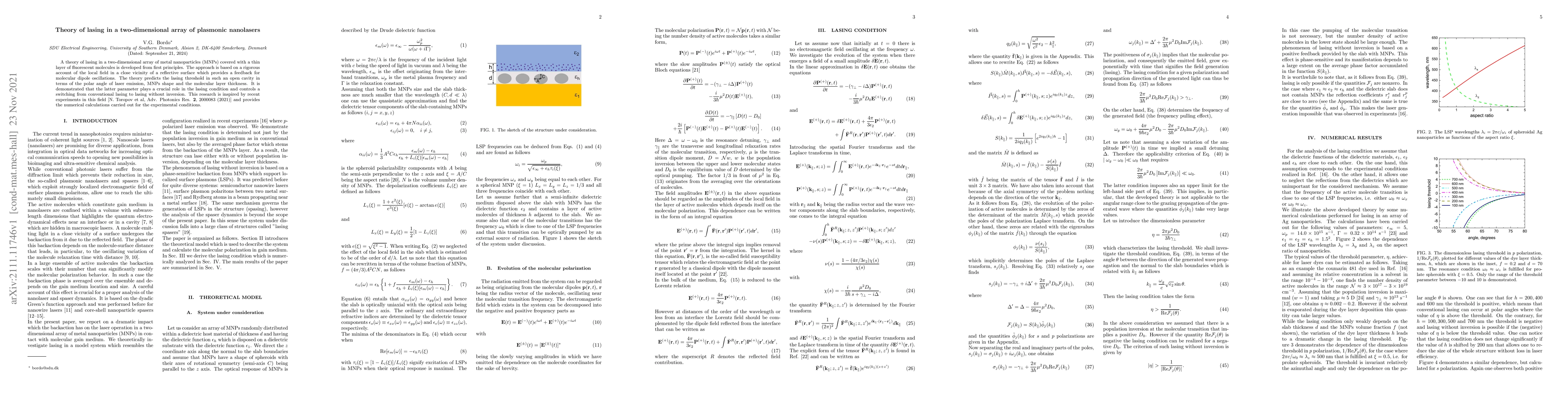 This paper develops a theoretical framework for lasing in a two-dimensional array of plasmonic nanolasers, predicting the lasing threshold based on the local field near reflective surfaces. The model highlights the critical role of the fluorescent molecules' layer thickness in determining the lasing conditions and enabling lasing without inversion.