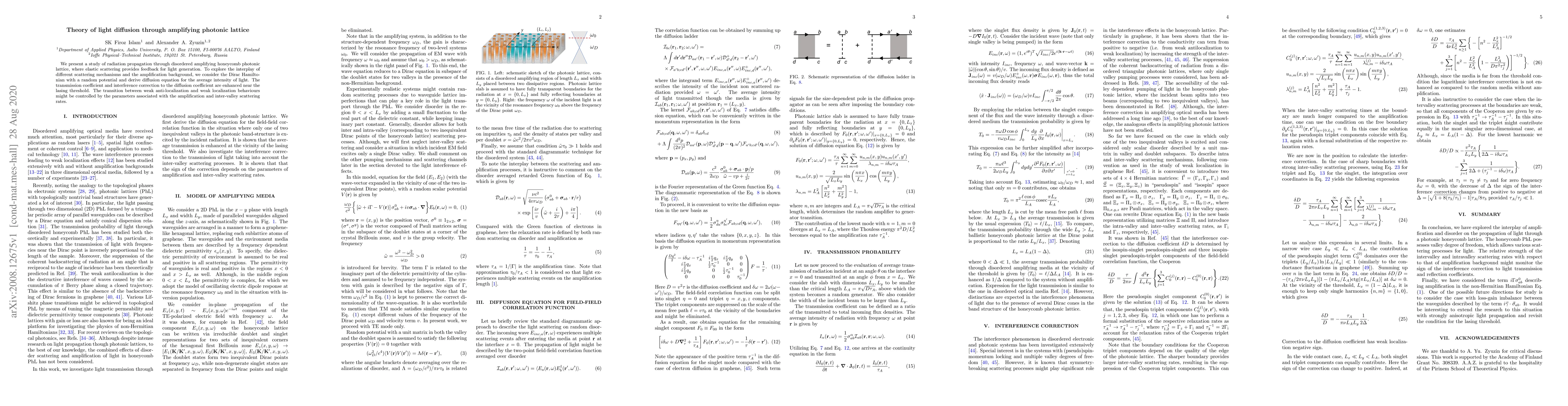 We present a study of radiation propagation through disordered amplifying honeycomb photonic lattice, where elastic scattering provides feedback for light generation. To explore the interplay of different scattering mechanisms and the amplification background, we consider the Dirac Hamiltonian with a random potential and derive diffusion equation for the average intensity of light. The transmission coefficient and interference correction to the diffusion coefficient are enhanced near the lasing threshold. The transition between weak anti-localization and weak localization behaviours might be controlled by the parameters associated with the amplification and inter-valley scattering rates.