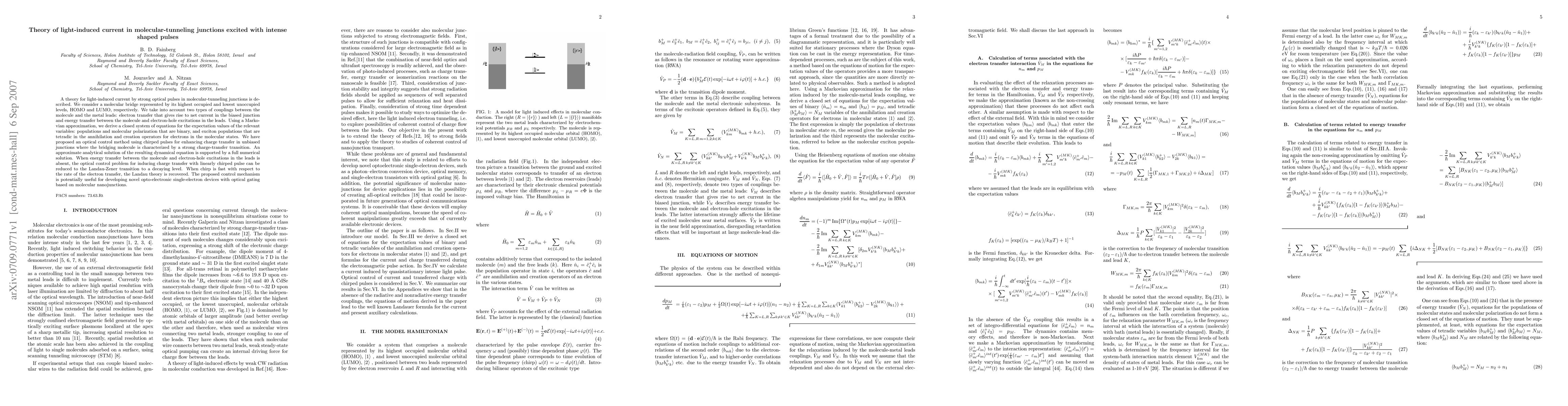 This paper develops a theoretical framework for light-induced current in molecular-tunneling junctions under intense shaped pulses, focusing on electron and energy transfer mechanisms. The proposed optical control method using chirped pulses aims to enhance charge transfer in unbiased junctions, potentially enabling novel opto-electronic single-electron devices based on molecular nanojunctions.