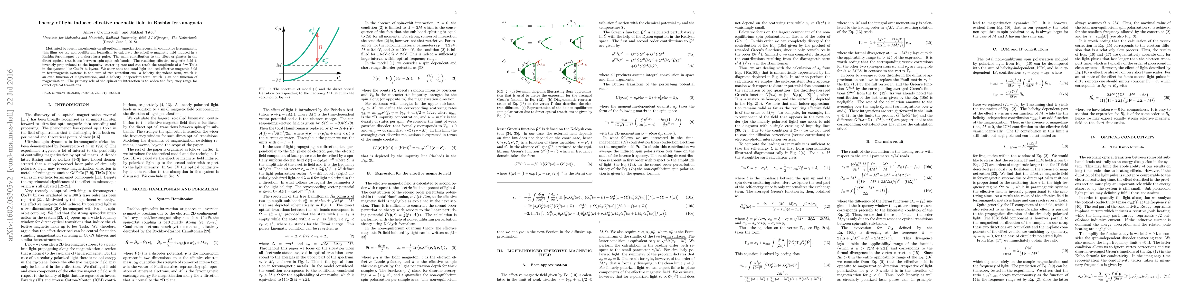 This paper investigates the light-induced effective magnetic field in Rashba ferromagnets using nonequilibrium formalism, revealing contributions from optical transitions between spin-split subbands. The effective magnetic field, reaching up to a few Tesla, is shown to depend on both helicity-dependent and independent terms, with spin-orbit interaction enhancing transition frequency ranges.