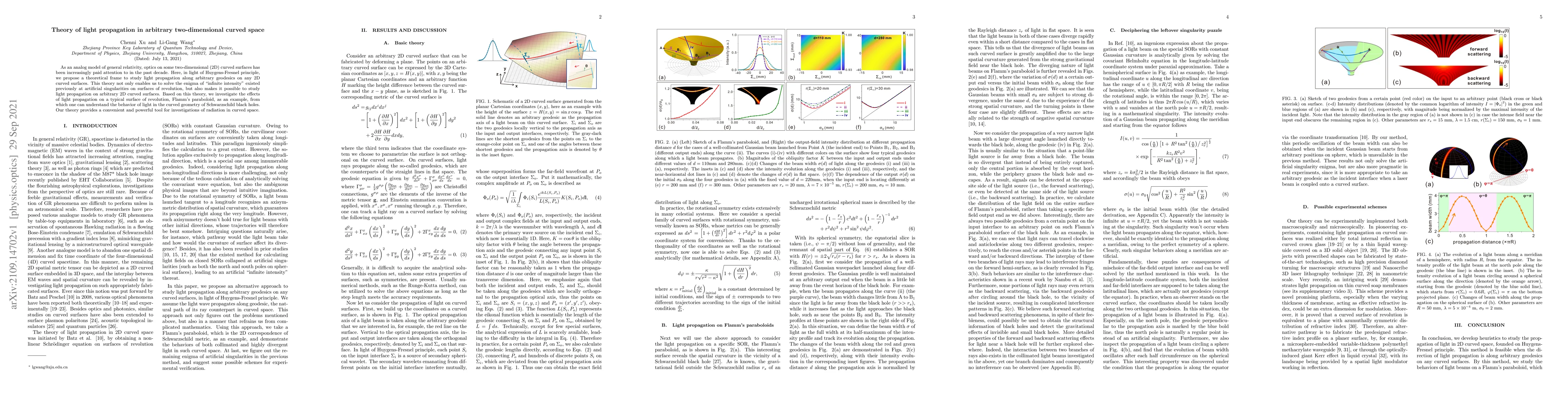 This paper proposes a theoretical framework for studying light propagation on arbitrary two-dimensional curved surfaces using the Huygens-Fresnel principle, resolving prior issues with intensity at singularities and enabling analysis of light behavior on various curved geometries, exemplified by Flamm's paraboloid and relevant to understanding light near Schwarzschild black holes.