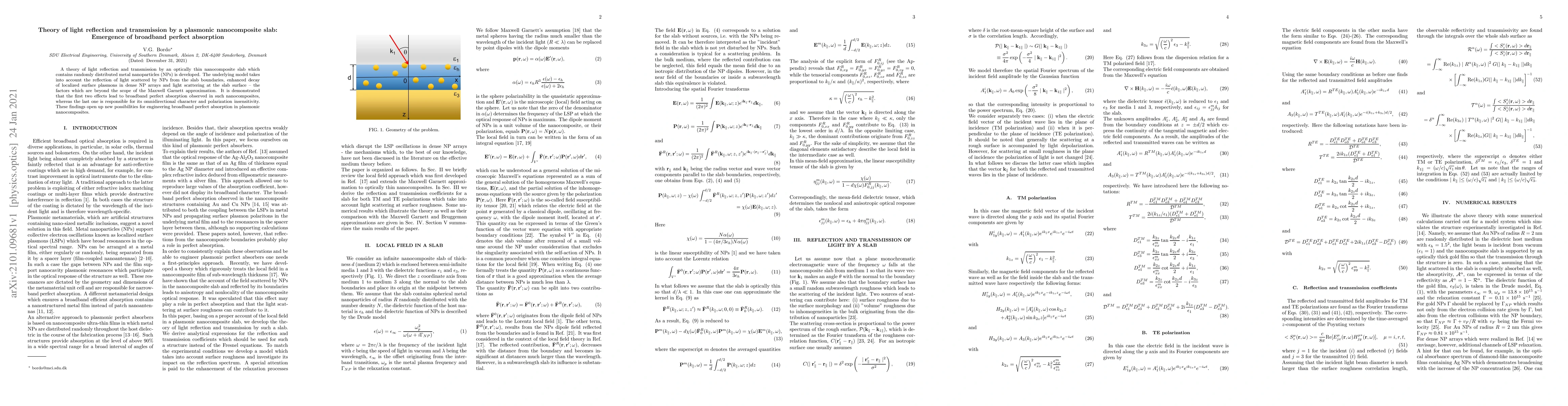 This paper develops a theory for light reflection and transmission in plasmonic nanocomposite slabs, showing that broadband perfect absorption arises from the reflection of light scattered by metal nanoparticles and enhanced decay of localized surface plasmons, while light scattering at the slab surface ensures omnidirectional and polarization-insensitive absorption.