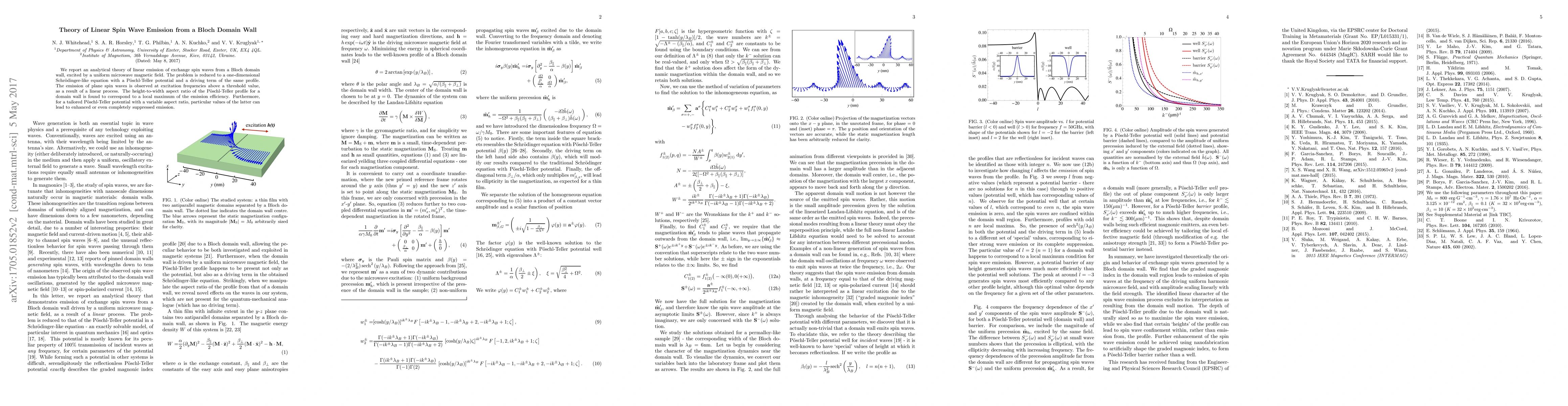 This paper presents an analytical theory for the linear emission of spin waves from a Bloch domain wall under microwave excitation, modeled by a one-dimensional Schrödinger-like equation. The study finds that spin wave emission occurs above a threshold frequency, with the emission efficiency peaking at specific aspect ratios of the P\"oschl-Teller potential.