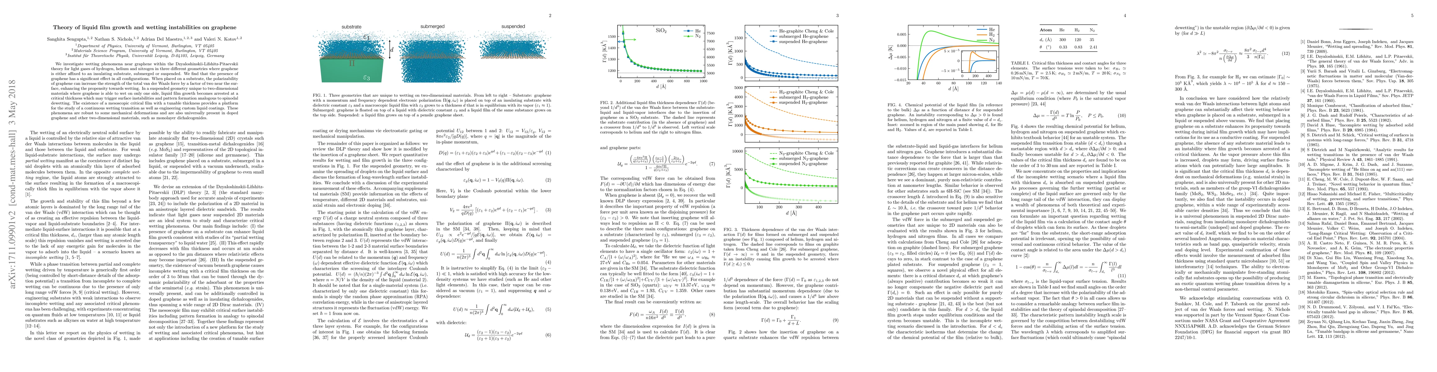 We investigate wetting phenomena near graphene within the Dzyaloshinskii-Lifshitz-Pitaevskii theory for light gases composed of hydrogen, helium and nitrogen in three different geometries where graphene is either affixed to an insulating substrate, submerged or suspended. We find that the presence of graphene has a significant effect in all configurations. In a suspended geometry where graphene is able to wet on only one side, liquid film growth becomes arrested at a critical thickness which may trigger surface instabilities and pattern formation analogous to spinodal dewetting. These phenomena are also universally present in other two-dimensional materials.