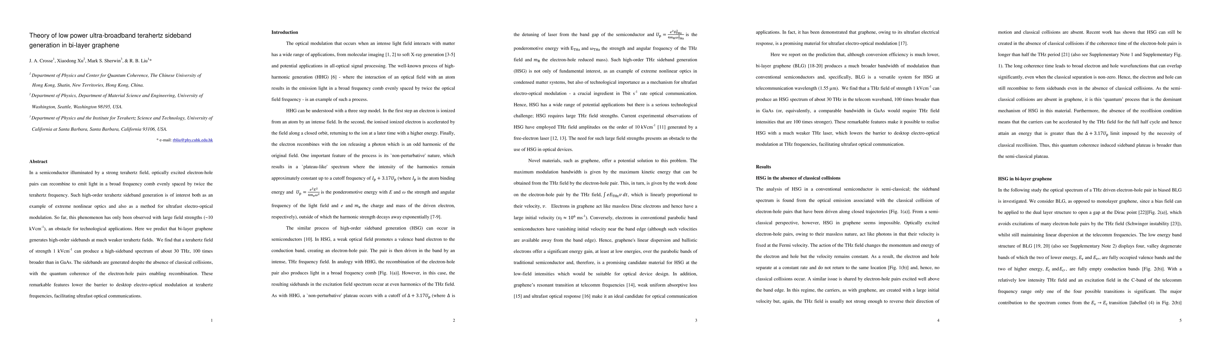 This paper predicts that bi-layer graphene can generate high-order terahertz sidebands at much weaker fields (1 kV/cm) compared to traditional semiconductors, enabling ultra-broadband terahertz sideband generation and ultrafast electro-optical modulation. The quantum coherence of electron-hole pairs in graphene facilitates this without classical collisions.