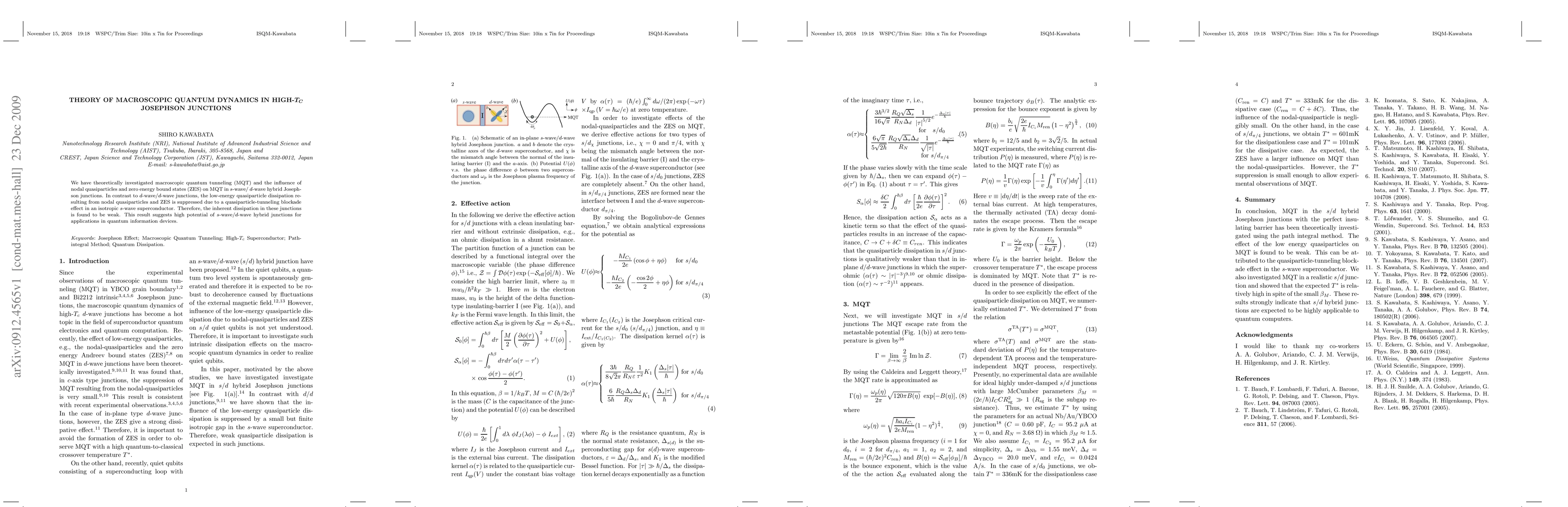 The study investigates macroscopic quantum tunneling in s-wave/d-wave hybrid Josephson junctions, revealing that nodal quasiparticles and zero energy bound states suppress low-energy quasiparticle dissipation, resulting in weak inherent dissipation and potential for quantum information applications.