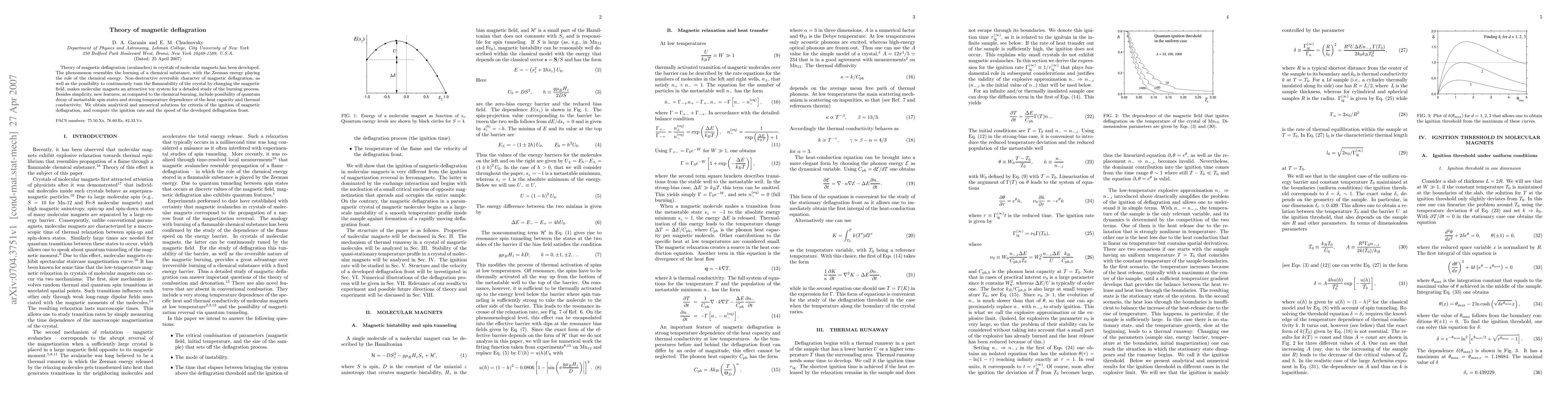 The paper develops a theory for magnetic deflagration in molecular magnet crystals, comparing it to chemical combustion. It highlights the reversible nature and tunable flammability by magnetic fields, and explores unique features like quantum decay and temperature dependencies. Analytical and numerical criteria for ignition, rate, and speed of the deflagration front are derived.
