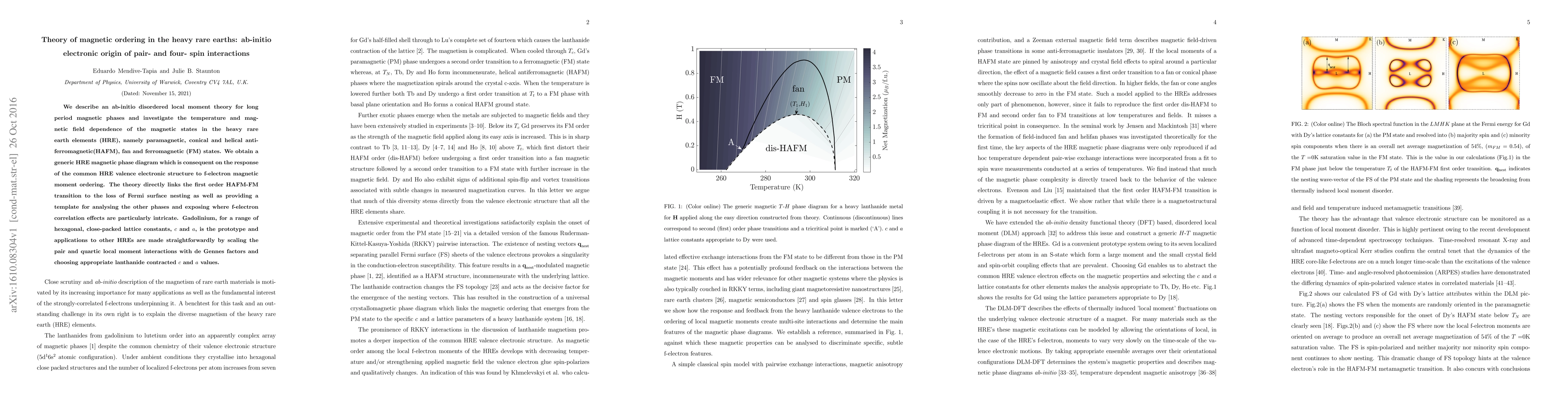 This paper presents an ab-initio theory for magnetic ordering in heavy rare earths, detailing the electronic origins of pair and four-spin interactions. It maps out a magnetic phase diagram for these elements, linking the HAFM-FM transition to the loss of Fermi surface nesting and providing a framework for analyzing complex f-electron correlations.