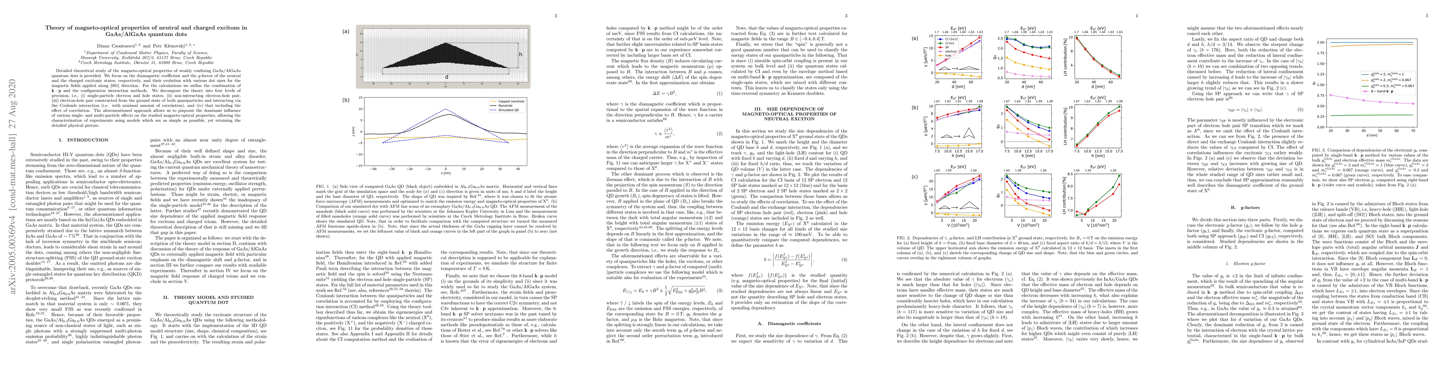 This paper provides a detailed theoretical analysis of the magneto-optical properties of GaAs/AlGaAs quantum dots, focusing on the diamagnetic coefficient and $g$-factor of neutral and charged excitons. The study employs ${\bf k}\cdot{\bf p}$ and configuration interaction methods to explore the effects of varying dot sizes and magnetic fields, revealing the influence of single- and multi-particle interactions.