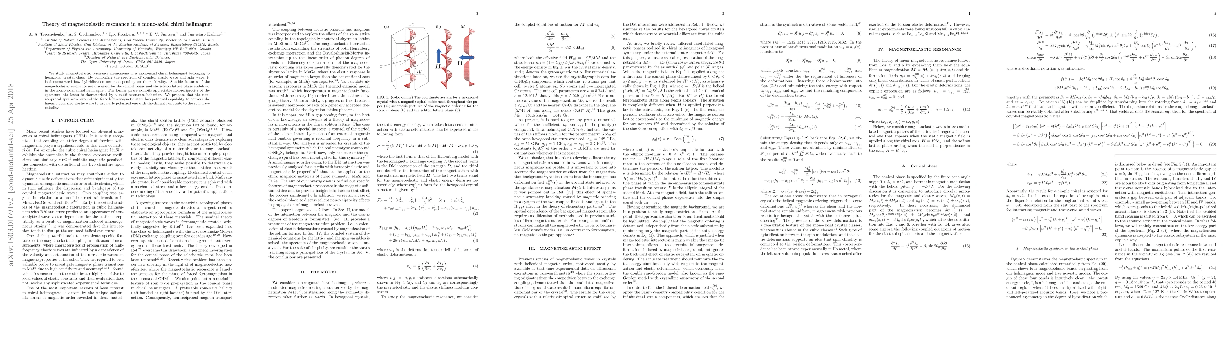 This paper investigates magnetoelastic resonance in mono-axial chiral helimagnets, revealing hybridization between elastic and spin waves influenced by chirality. It highlights non-reciprocity in the conical phase and multi-resonance in the soliton lattice phase, proposing a method for converting linearly polarized elastic waves to circularly polarized ones via non-reciprocal spin waves.
