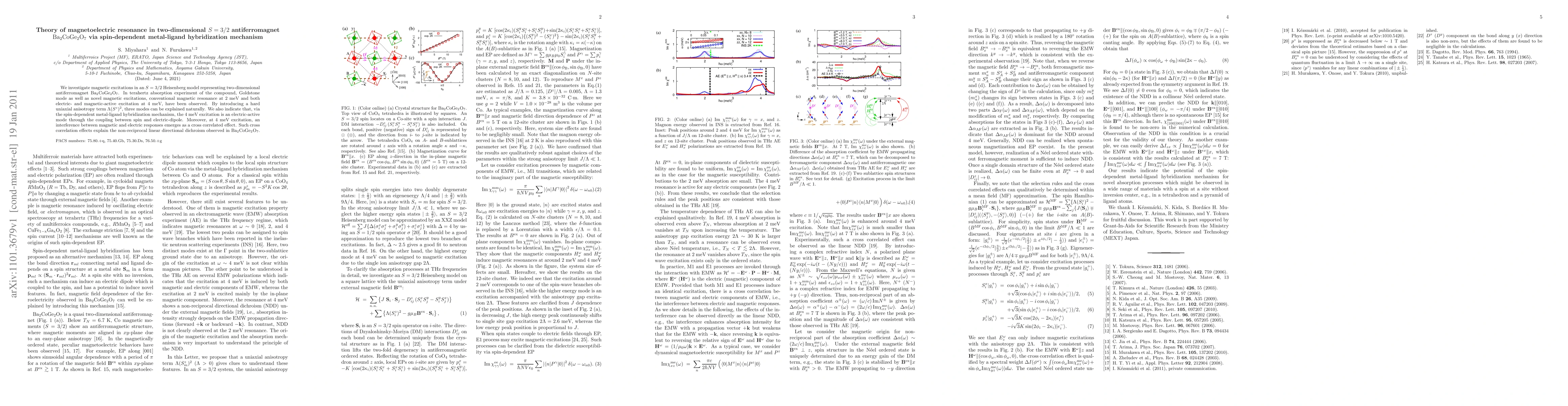 We investigate magnetic excitations in an $S=3/2$ Heisenberg model representing two-dimensional antiferromagnet ${\rm Ba_2CoGe_2O_7}$. In terahertz absorption experiment of the compound, Goldstone mode as well as novel magnetic excitations, conventional magnetic resonance at 2 meV and both electric- and magnetic-active excitation at 4 meV, have been observed. By introducing a hard uniaxial anisotropy term $\Lambda (S^z)^2$, three modes can be explained naturally. We also indicate that, via the spin-dependent metal-ligand hybridization mechanism, the 4 meV excitation is an electric-active mode through the coupling between spin and electric-dipole. Moreover, at 4 meV excitation, an interference between magnetic and electric responses emerges as a cross correlated effect. Such cross correlation effects explain the non-reciprocal linear directional dichroism observed in ${\rm Ba_2CoGe_2O_7}$.