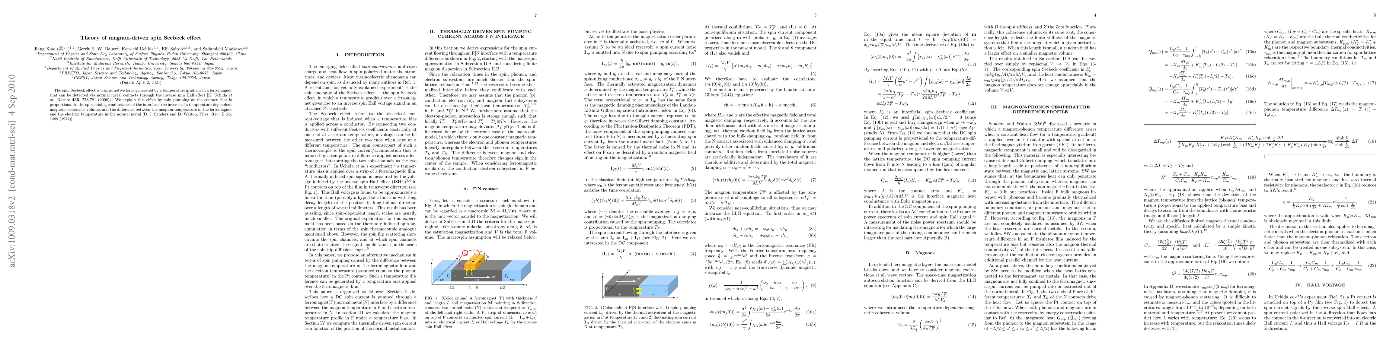 This paper explains the spin Seebeck effect through magnon-driven spin pumping at the interface between a ferromagnet and a normal metal, attributing it to the temperature difference between magnons in the ferromagnet and electrons in the metal. The effect is proportional to the spin-mixing conductance and a temperature-dependent magnetic coherence volume.