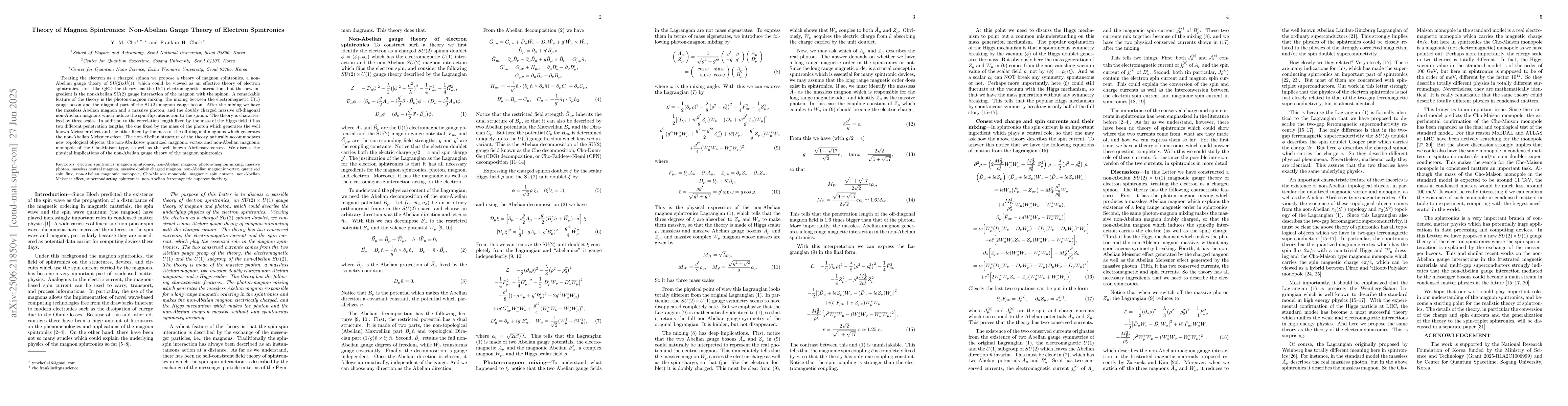 The paper proposes a non-Abelian gauge theory of magnon spintronics, treating electrons as charged spinons. It introduces a unique SU(2)xU(1) theory with photon-magnon mixing, resulting in massless magnon and massive photon. The theory also features topological objects like magnonic vortices and monopoles, offering new insights into spintronics.