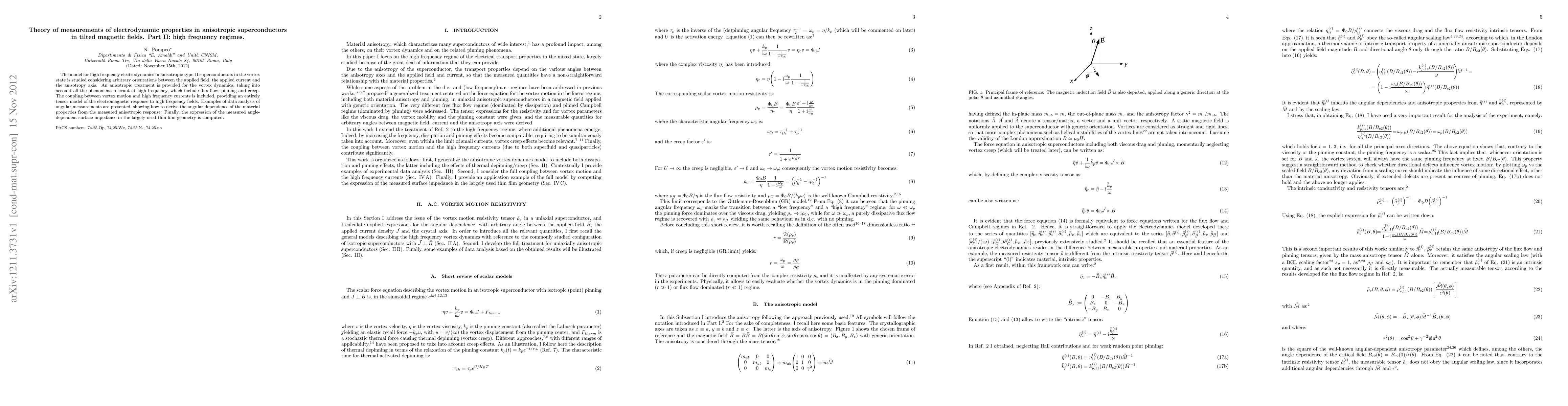 The model for high frequency electrodynamics in anisotropic type-II superconductors in the vortex state is studied considering arbitrary orientations between the applied field, the applied current and the anisotropy axis. An anisotropic treatment is provided for the vortex dynamics, taking into account all the phenomena relevant at high frequency, which include flux flow, pinning and creep. The coupling between vortex motion and high frequency currents is included, providing an entirely tensor model of the electromagnetic response to high frequency fields. Examples of data analysis of angular measurements are presented, showing how to derive the angular dependence of the material properties from the measured anisotropic response. Finally, the expression of the measured angle-dependent surface impedance in the largely used thin film geometry is computed.