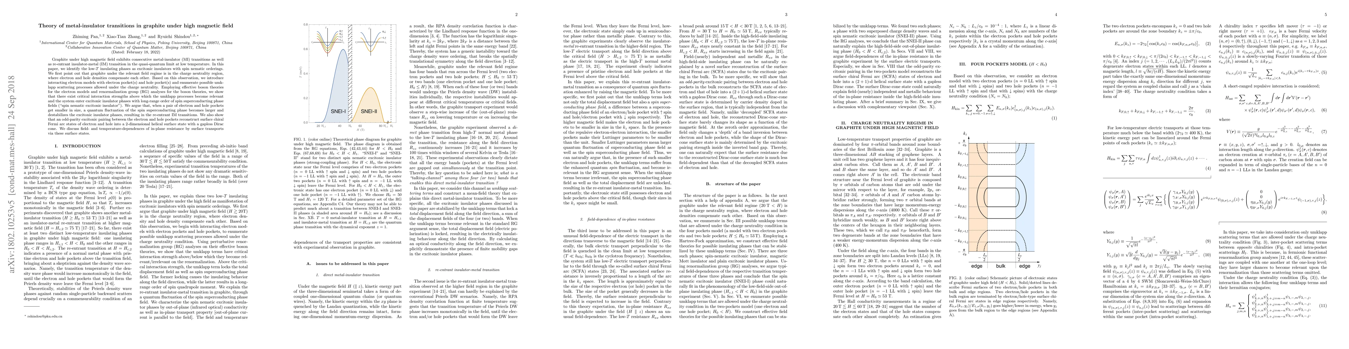 This paper investigates graphite's metal-insulator transitions under high magnetic fields, identifying low-temperature insulating phases as excitonic insulators with spin nematic orderings. It demonstrates that critical interaction strengths lead to excitonic insulator phases, while quantum fluctuations cause re-entrant metal-insulator transitions, and discusses the implications for surface transport states.