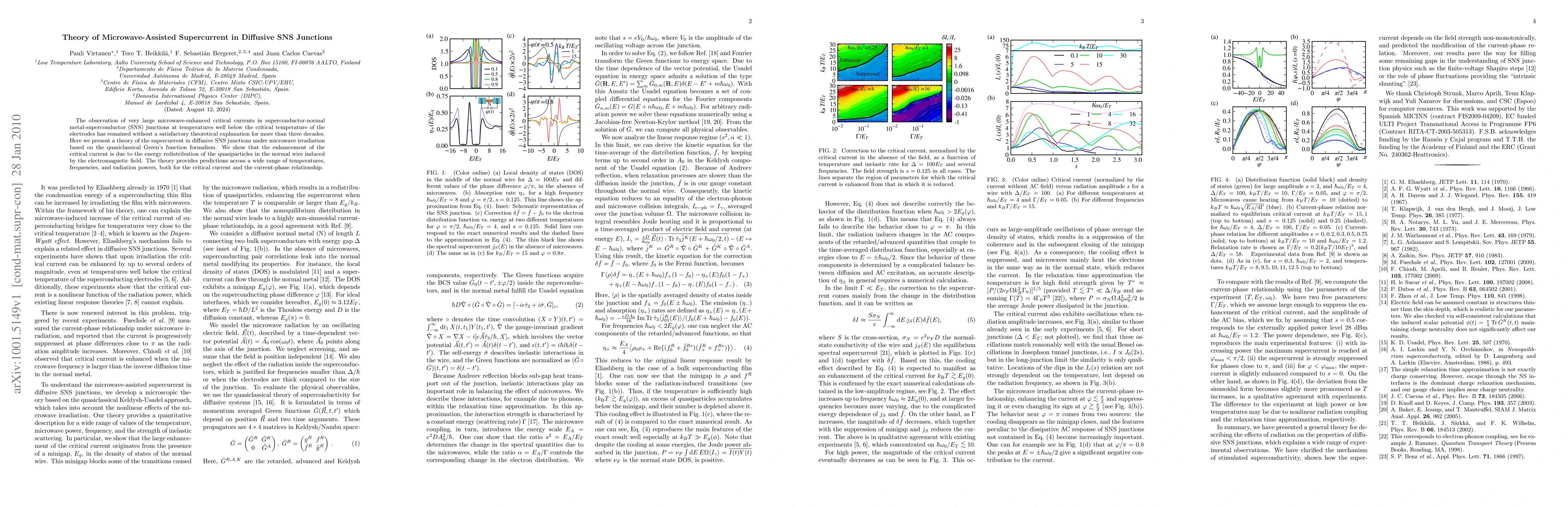 This paper presents a theoretical framework explaining the large microwave-enhanced critical currents in SNS junctions using quasiclassical Green's function formalism, attributing the enhancement to quasiparticle energy redistribution in the normal wire under electromagnetic fields. The theory provides comprehensive predictions for critical current and current-phase relationship across various temperatures, frequencies, and radiation powers.