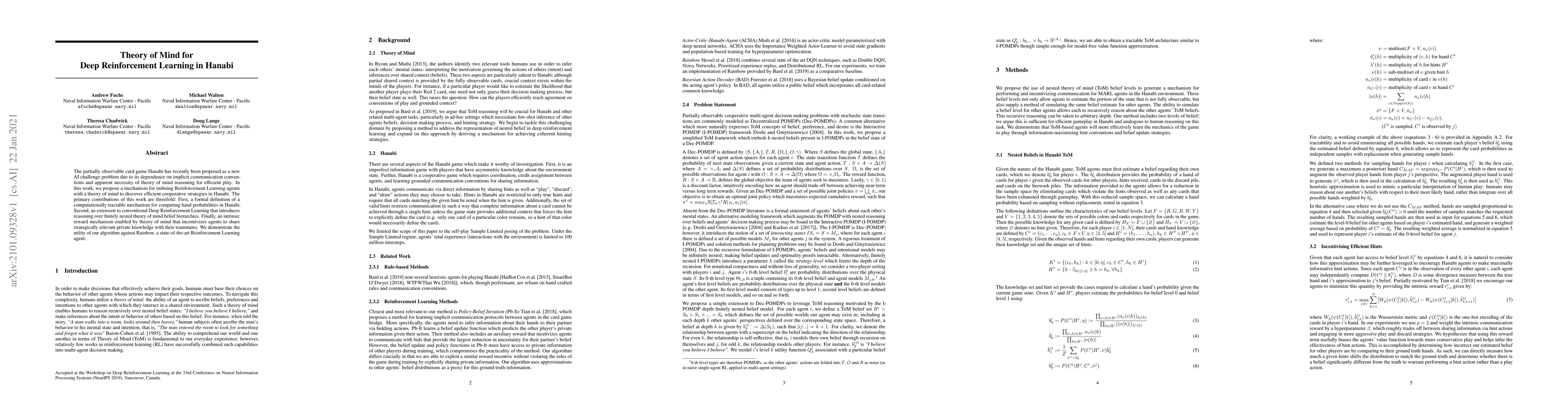 This paper proposes a mechanism to equip Reinforcement Learning agents with theory of mind for playing Hanabi, a card game requiring communication and cooperative strategies. It introduces a computationally feasible method for calculating hand probabilities, extends Deep Reinforcement Learning to handle nested belief hierarchies, and designs an intrinsic reward system to encourage knowledge sharing among agents.