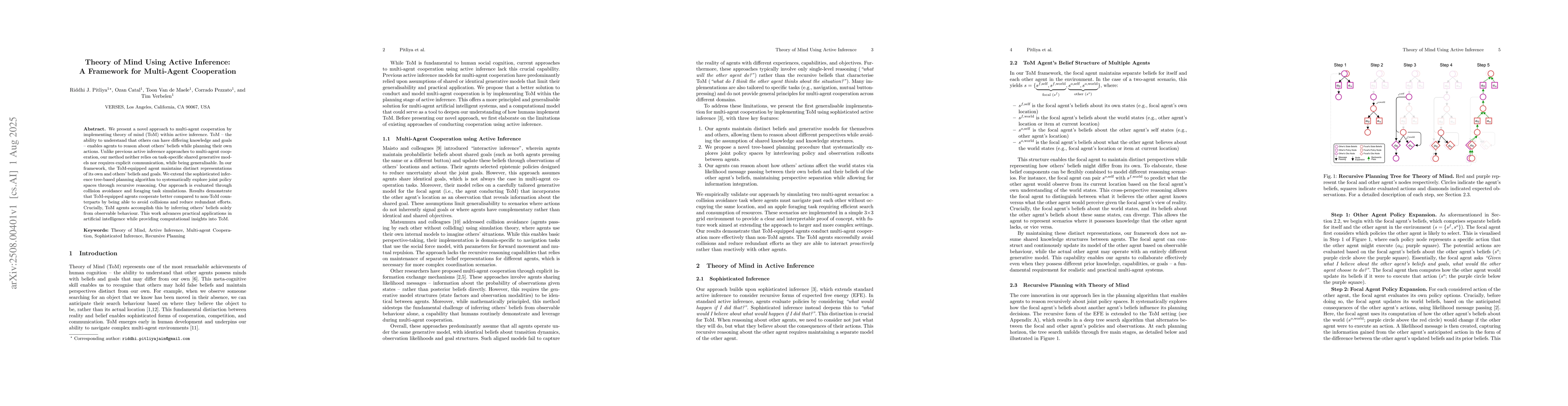 We present a novel approach to multi-agent cooperation by implementing theory of mind (ToM) within active inference. ToM - the ability to understand that others can have differing knowledge and goals - enables agents to reason about others' beliefs while planning their own actions. Unlike previous active inference approaches to multi-agent cooperation, our method neither relies on task-specific shared generative models nor requires explicit communication, while being generalisable. In our framework, the ToM-equipped agent maintains distinct representations of its own and others' beliefs and goals. We extend the sophisticated inference tree-based planning algorithm to systematically explore joint policy spaces through recursive reasoning. Our approach is evaluated through collision avoidance and foraging task simulations. Results demonstrate that ToM-equipped agents cooperate better compared to non-ToM counterparts by being able to avoid collisions and reduce redundant efforts. Crucially, ToM agents accomplish this by inferring others' beliefs solely from observable behaviour. This work advances practical applications in artificial intelligence while providing computational insights into ToM.