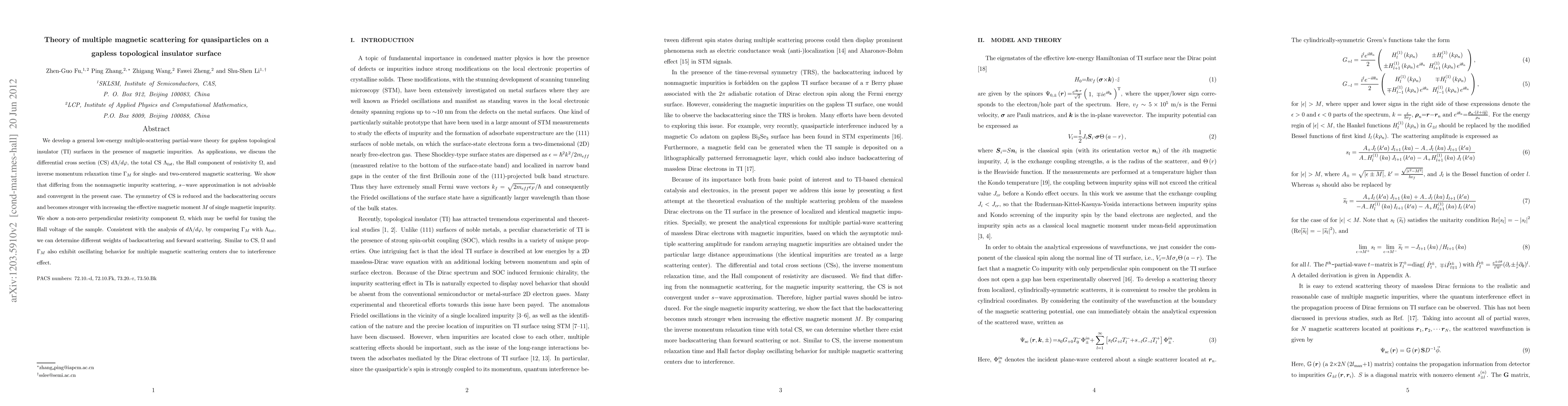 This paper develops a multiple-scattering theory for quasiparticles on gapless topological insulator surfaces with magnetic impurities, showing that $s\mathtt{-}$wave approximation is inadequate. It reveals enhanced backscattering and a non-zero perpendicular resistivity component, useful for tuning Hall voltage, and demonstrates oscillating behaviors in scattering and resistivity due to interference effects.
