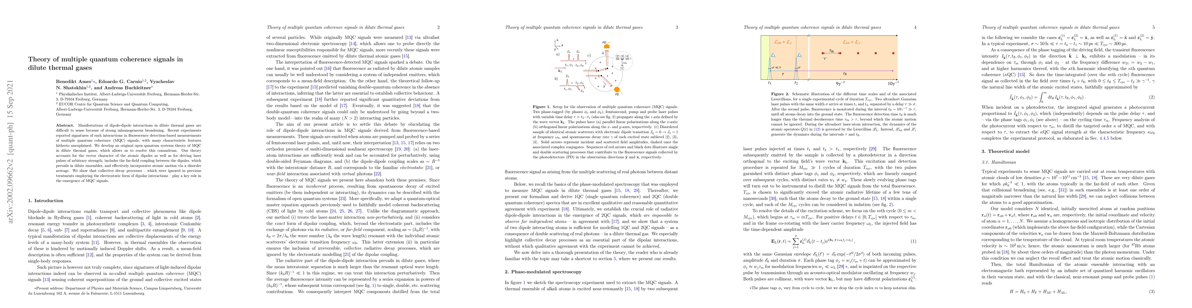 This paper develops a novel theory for multiple quantum coherence signals in dilute thermal gases, explaining previously unexplained signatures in fluorescence detection. It accounts for atomic dipole interactions, laser pulse strengths, and collective decay processes, resolving the issue of strong inhomogeneous broadening.